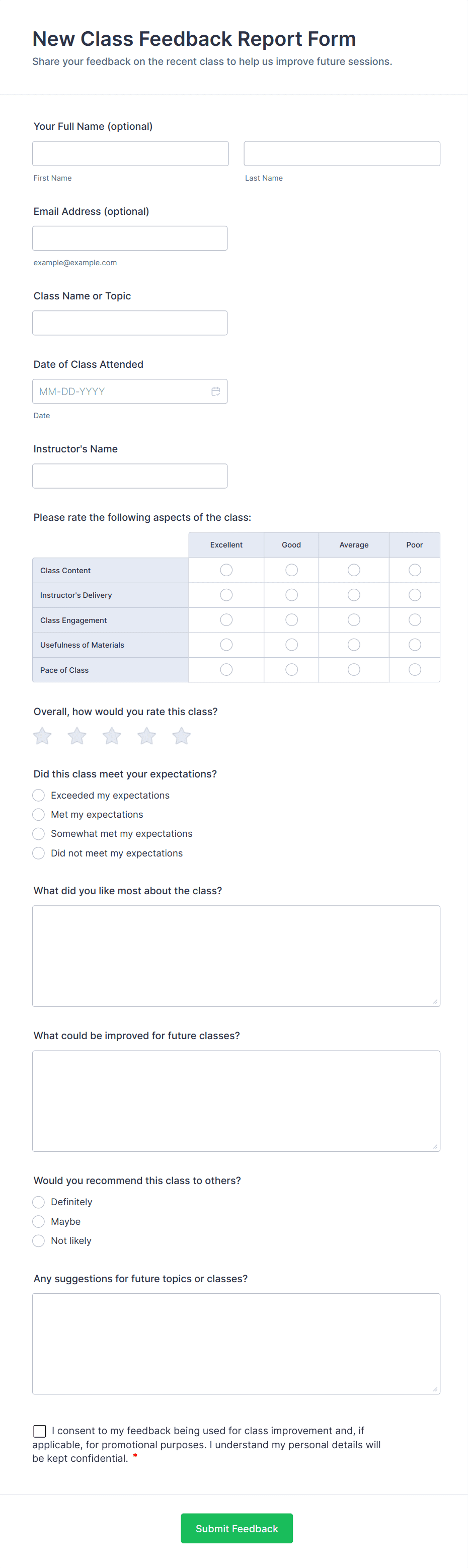 - Multiple choice or rating scale questions (e.g., “Rate the instructor’s effectiveness”)