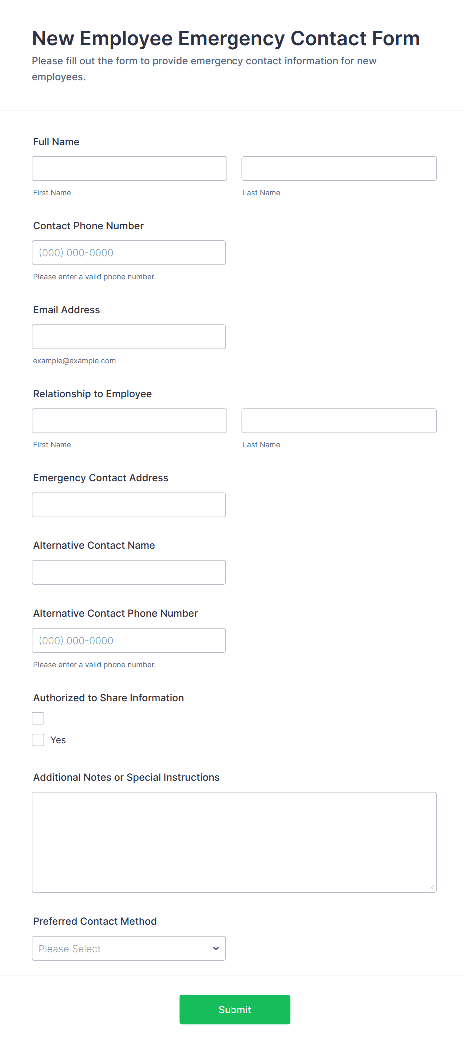 - Workplaces: Forms might request employee’s primary and secondary contacts, relationship to the employee, and consent for information sharing.