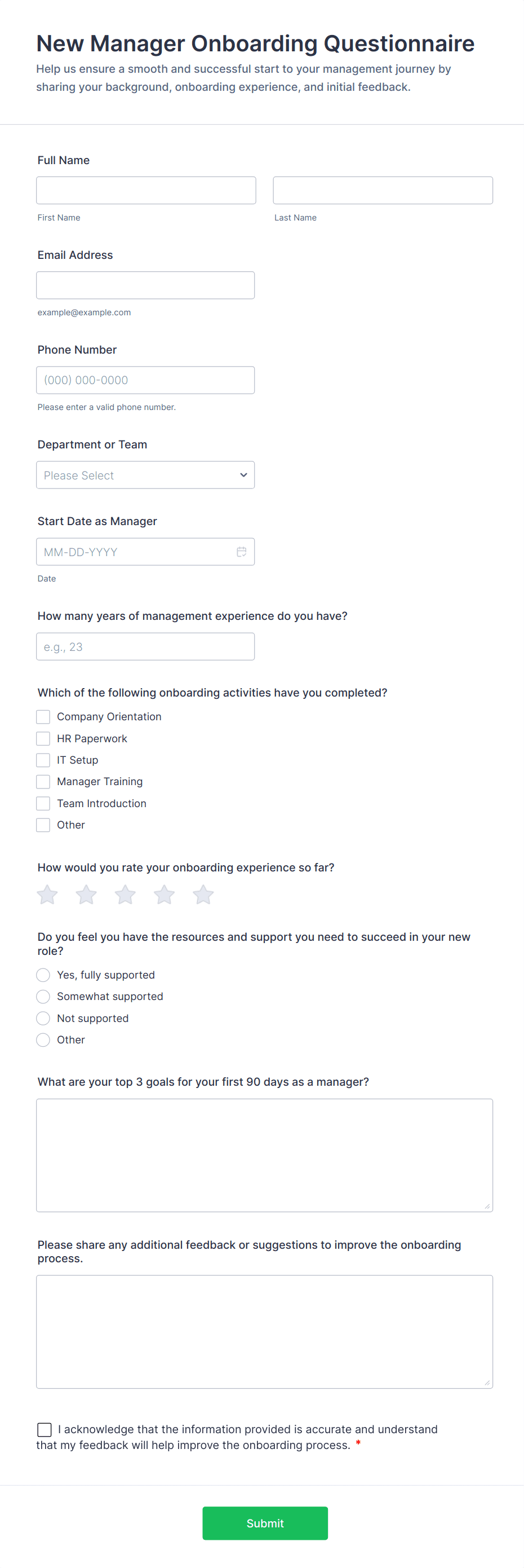 An Onboarding Feedback Questionnaire is a form template designed to gather actionable insights that enable organizations to continuously improve their onboarding processes, enhance employee engagement and retention, and ensure alignment with company culture and values.