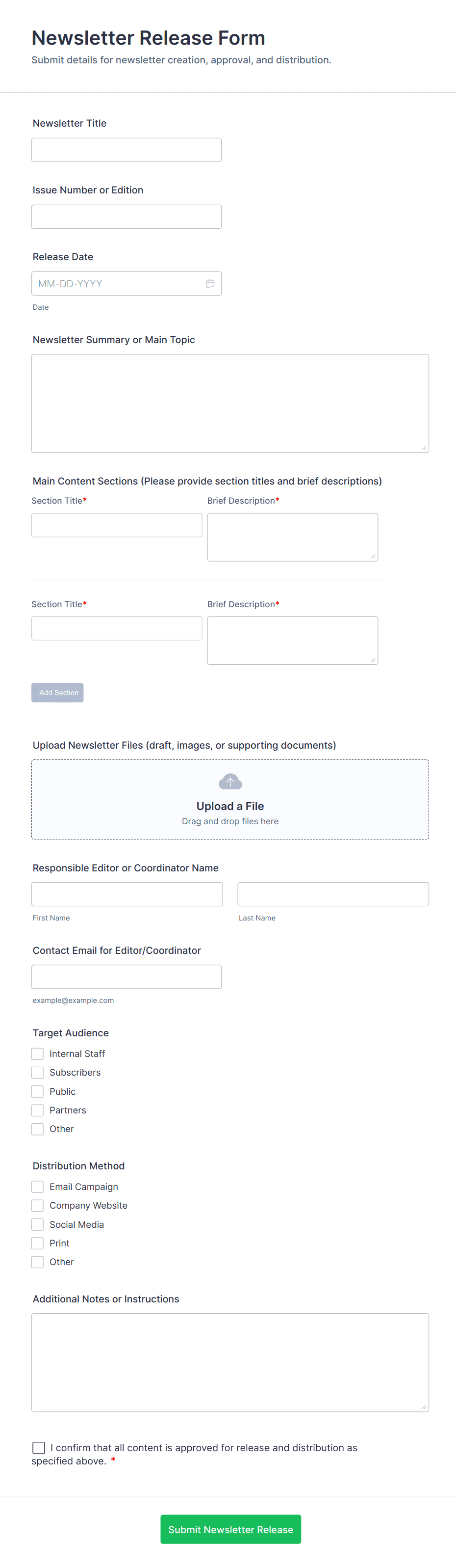 Email marketing forms are specialized online forms designed to collect, manage, and segment email addresses and related information for marketing campaigns. These forms are essential tools for businesses, organizations, and marketers aiming to grow their subscriber lists, nurture leads, and engage audiences through targeted email communications. Common use cases include newsletter sign-ups, event invitations, lead generation, feedback collection, promotional offers, and customer onboarding. By capturing key details such as names, preferences, and consent, email marketing forms help ensure that your communications reach the right people with relevant content.