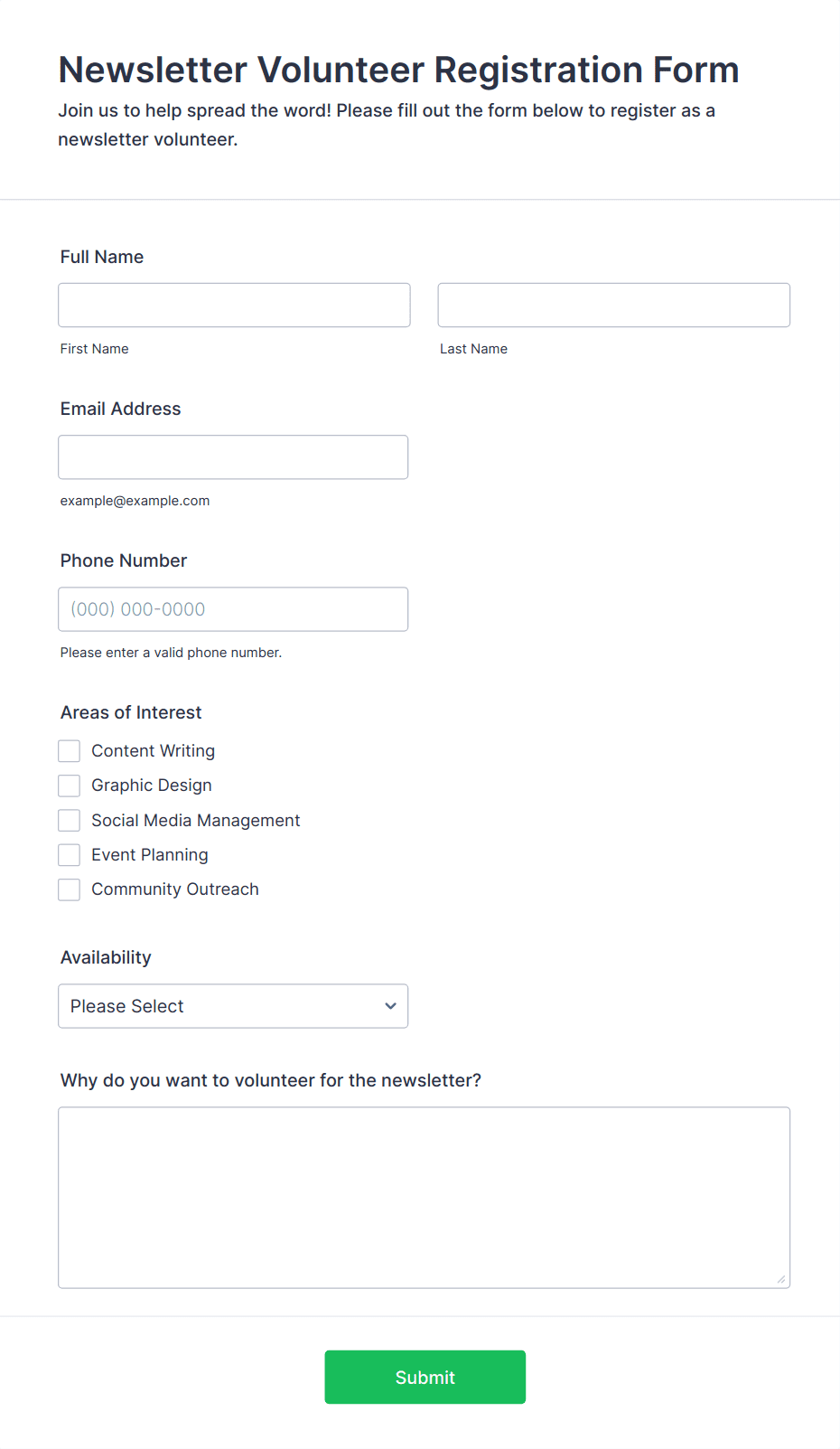 • Ongoing Program Enrollment: Nonprofits or community centers use forms to register volunteers for recurring programs, capturing long-term commitment and skill sets.
