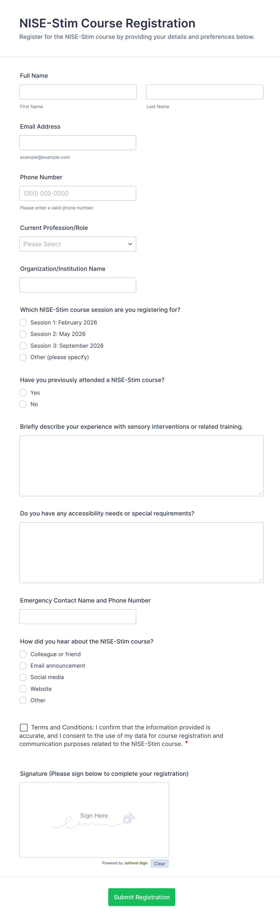 Typical fields include participant name, contact details, session selection, payment information, dietary or accessibility needs, and consent agreements.