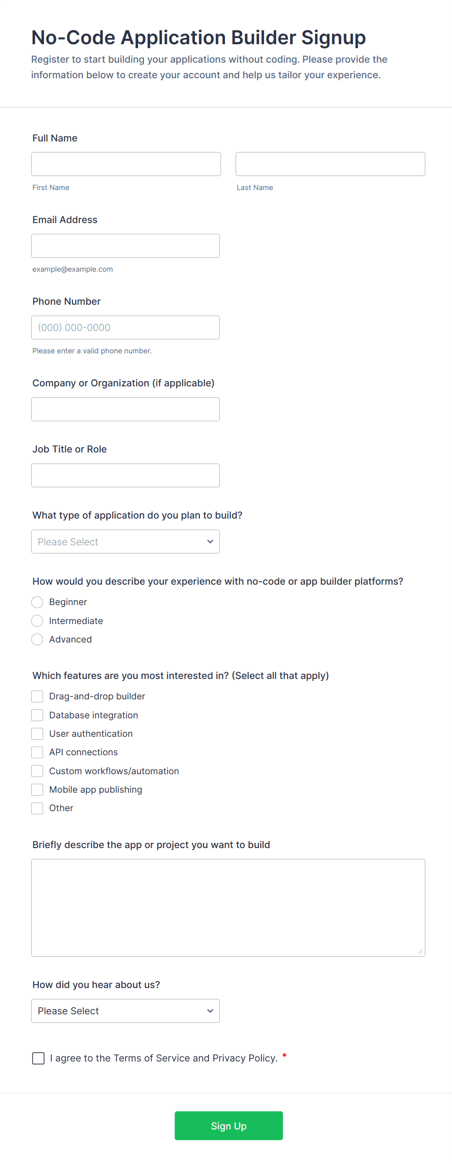 Sign up forms are essential digital tools used to collect information from individuals who wish to join, subscribe, or participate in a service, event, or platform. Whether you’re managing event registrations, building an email subscriber list, onboarding new members, or recruiting volunteers, sign up forms streamline the process of gathering key details such as names, contact information, preferences, and consent. Their versatility makes them invaluable for businesses, educational institutions, nonprofits, clubs, and community organizations looking to efficiently manage participation and engagement.
