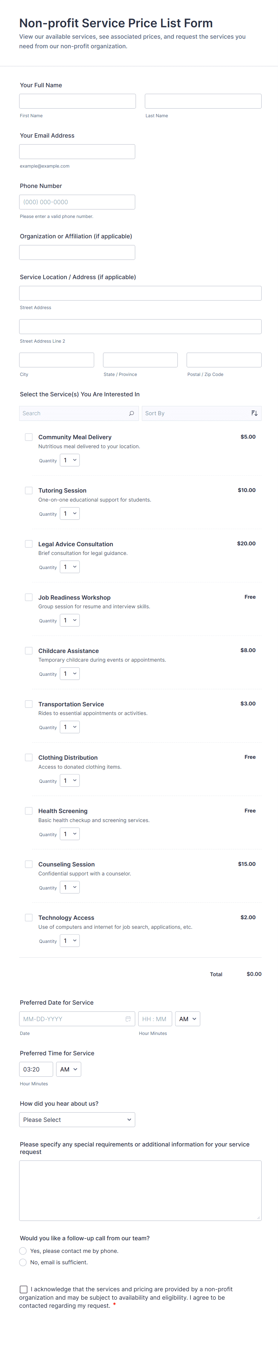 A comprehensive form that can be used for online booking reservations, transportation planning, tours, pickups; with widgets that allow collecting any information, location services, date-time selection, suggestion areas and more.