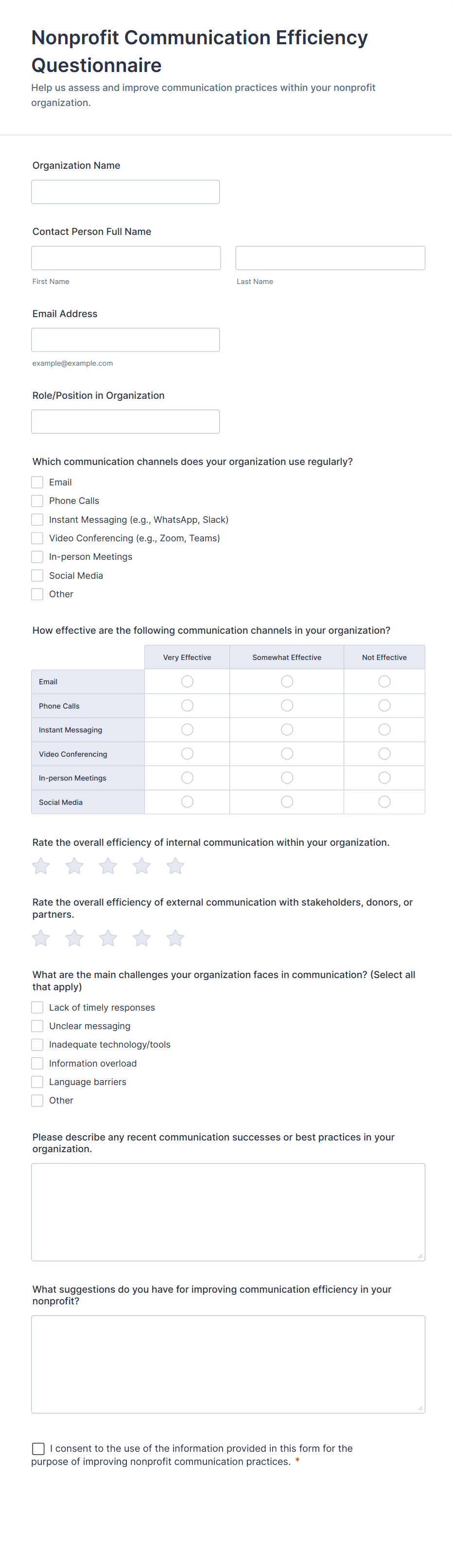 • Content and fields differ based on the objective: e.g., a health screening questionnaire may include medical history and symptom checklists, while a customer feedback form focuses on satisfaction ratings and open-ended comments.