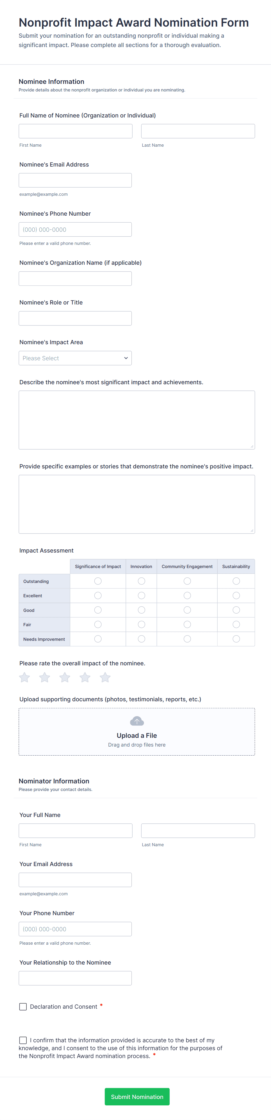 Collect nominee name, role or affiliation, and contact details if needed. Add nominator details and relationship to nominee.