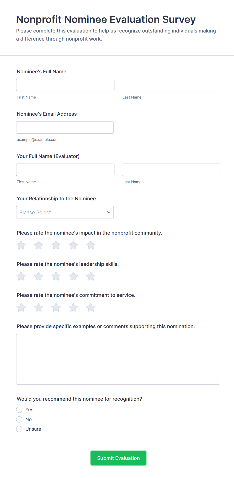 Evaluation surveys are structured tools designed to gather feedback, measure satisfaction, and assess the effectiveness of programs, services, events, or products. They are widely used across various industries and sectors, including education, healthcare, business, and nonprofit organizations, to collect valuable insights from participants, clients, employees, or stakeholders. Common use cases include course evaluations, employee performance reviews, event feedback, customer satisfaction assessments, and program impact studies. By systematically collecting and analyzing responses, organizations can identify strengths, uncover areas for improvement, and make informed decisions to enhance their offerings.