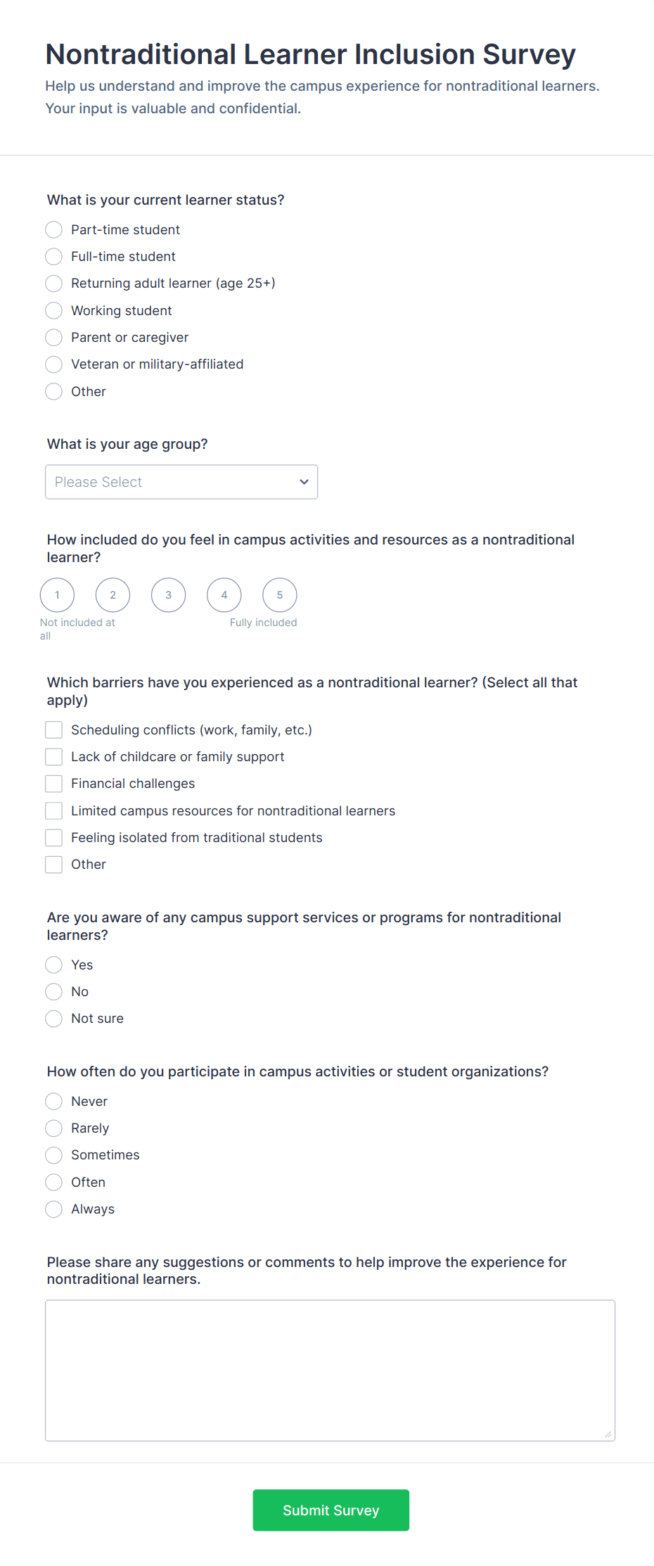 • For campus climate surveys: Use anonymous response settings, branching logic for sensitive topics, and demographic questions.