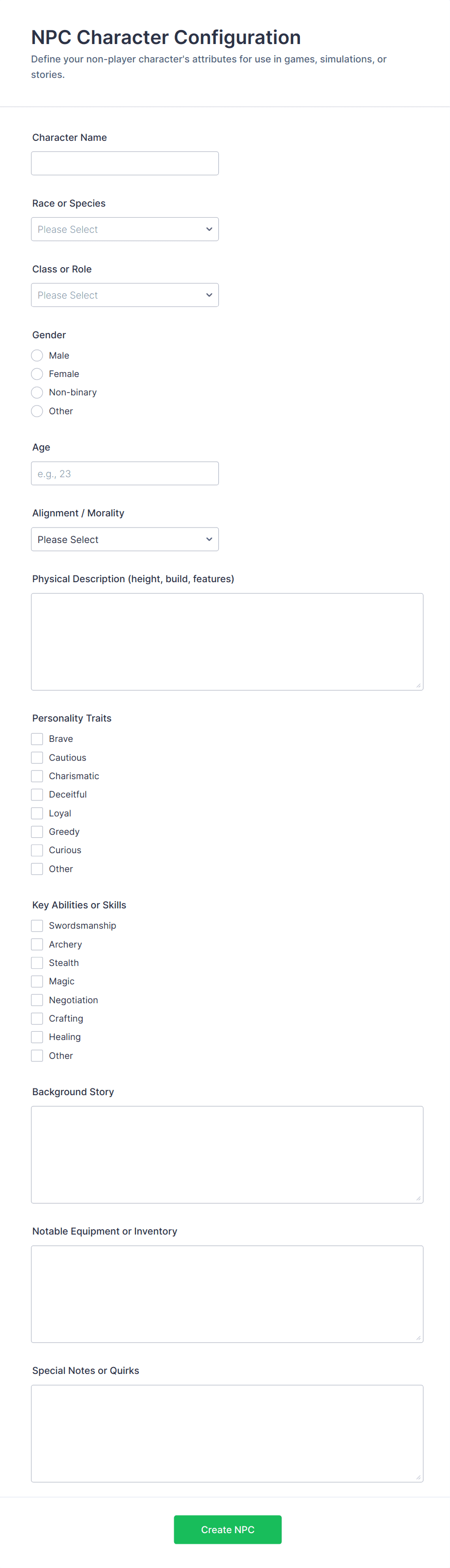 A Role Play Application Form is a form template that simplifies role selection and approval for gaming or educational purposes. It eases the process by eliminating physical paperwork, providing a clear, intuitive interface. Improve your role-play experiences with Jotform's digital solution.