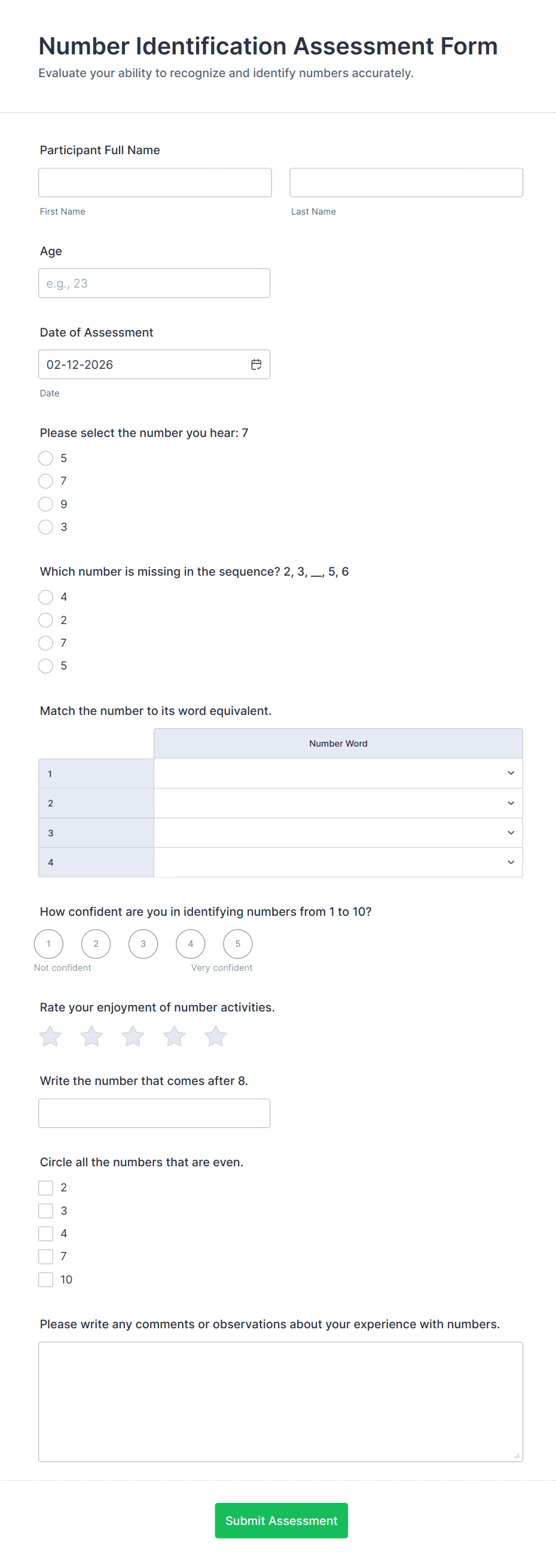 Student assessment forms are structured documents used to evaluate student learning, skills, progress, and performance in a consistent and trackable way. They help educators collect evidence of understanding, measure outcomes against criteria, and document feedback that supports student development. Student assessment forms are commonly used in schools, universities, training programs, and tutoring services for quizzes, skill evaluations, rubric-based grading, observation checklists, and progress monitoring. By standardizing how assessments are recorded, these forms reduce grading inconsistency, improve feedback quality, and make it easier to track student growth over time.