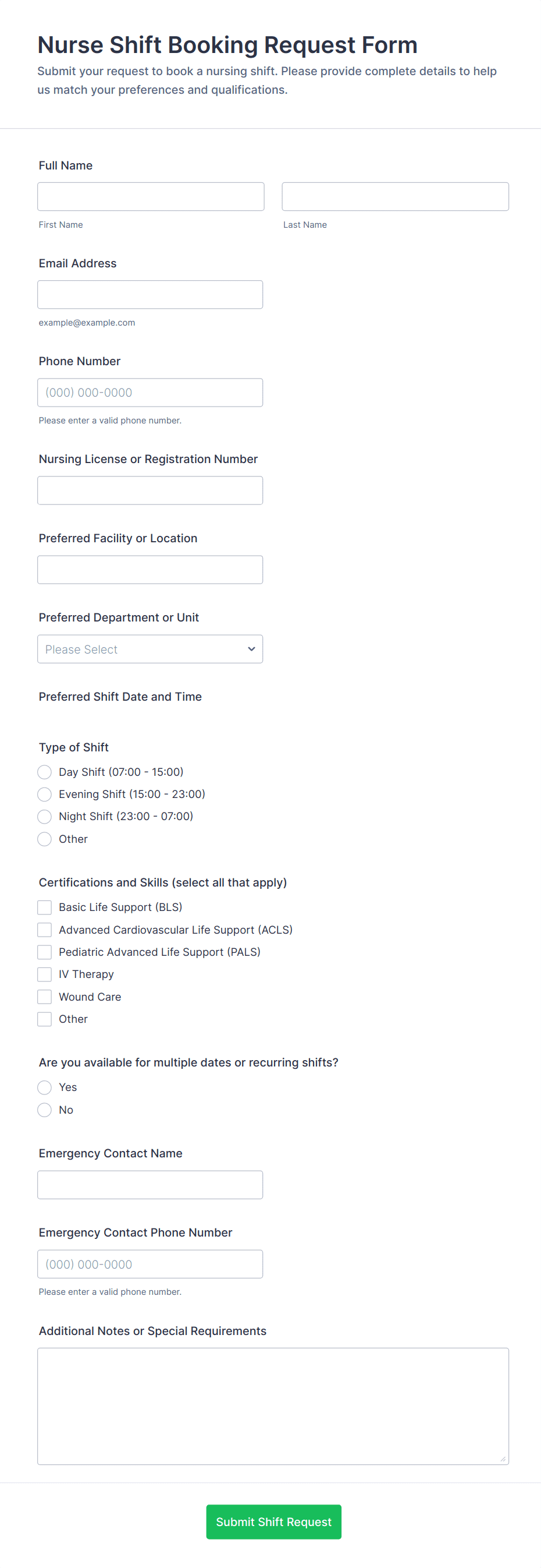 A nurse form is a digital or paper document used by nurses to collect, record, and manage patient information, medical histories, incident reports, and other healthcare-related data.