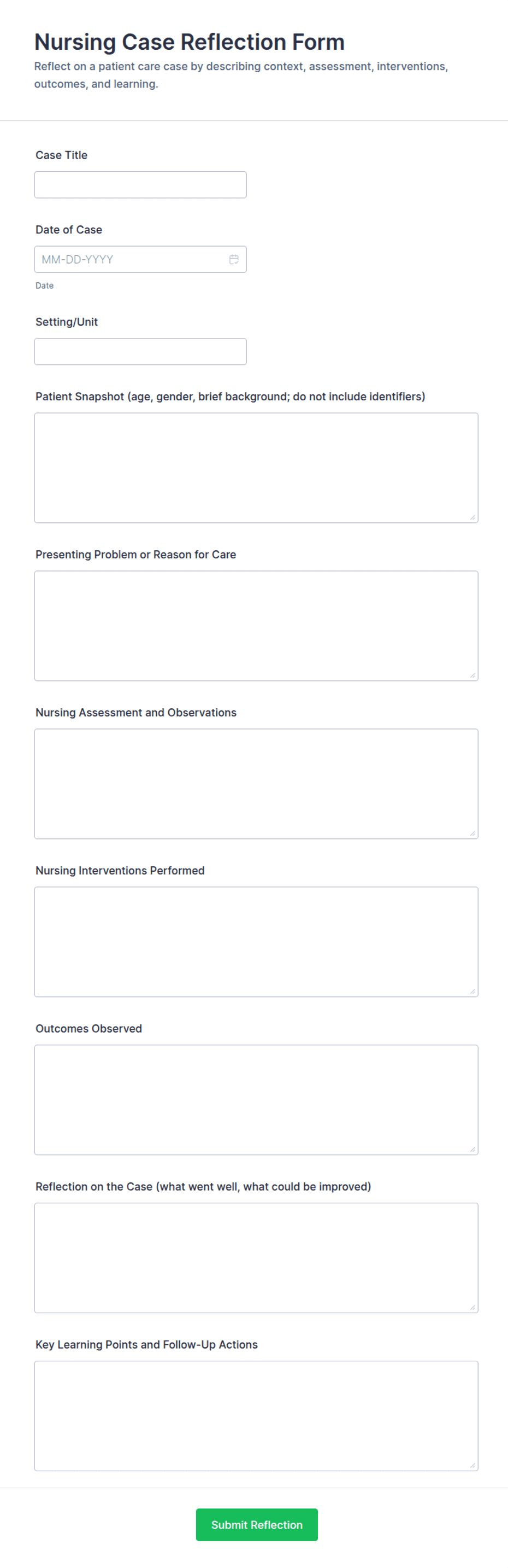 A nurse form is a digital or paper document used by nurses to collect, record, and manage patient information, medical histories, incident reports, and other healthcare-related data.