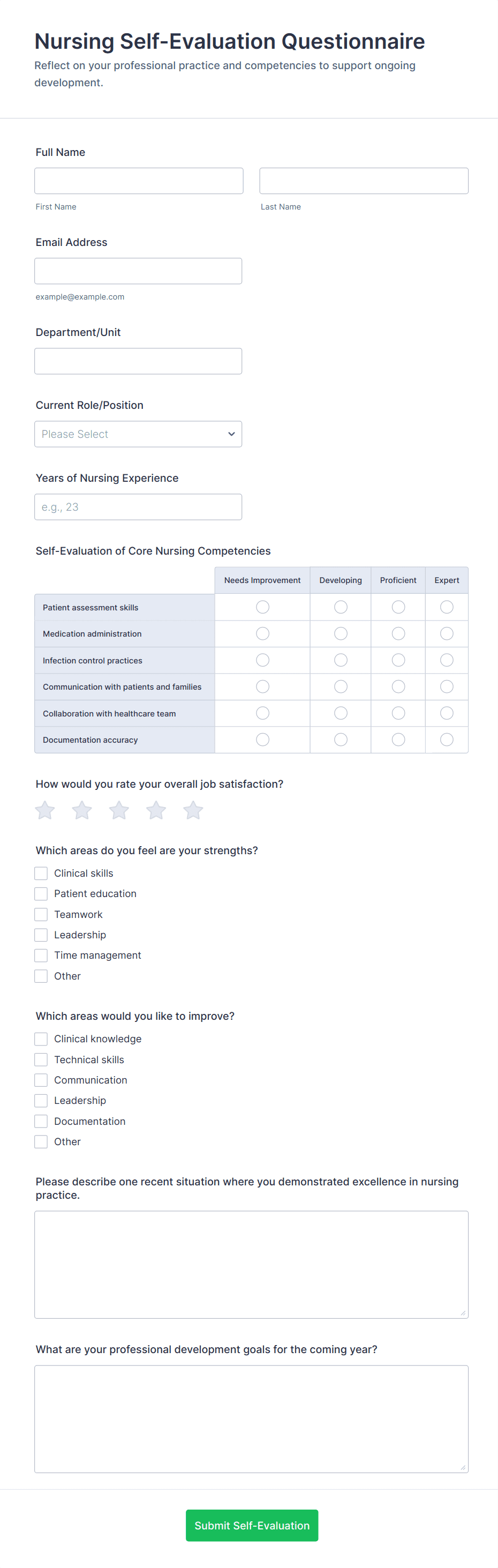 Need a quick but secure way to collect nursing information for your practice? Switch from paper forms to online forms and give your nurses a better way to gather health data from any device with our free Nurse Forms. Explore templates that make it easy to collect surveys, registrations, and evaluations, or to track medications, complete performance evaluations, and accomplish other internal tasks. All of our templates are fully customizable with our drag-and-drop builder, so you can get the look you want with no coding required! Jotform even offers an option to upgrade for HIPAA compliance features. Create a complete online database of all your nursing information with Jotform’s powerful Nurse Forms.