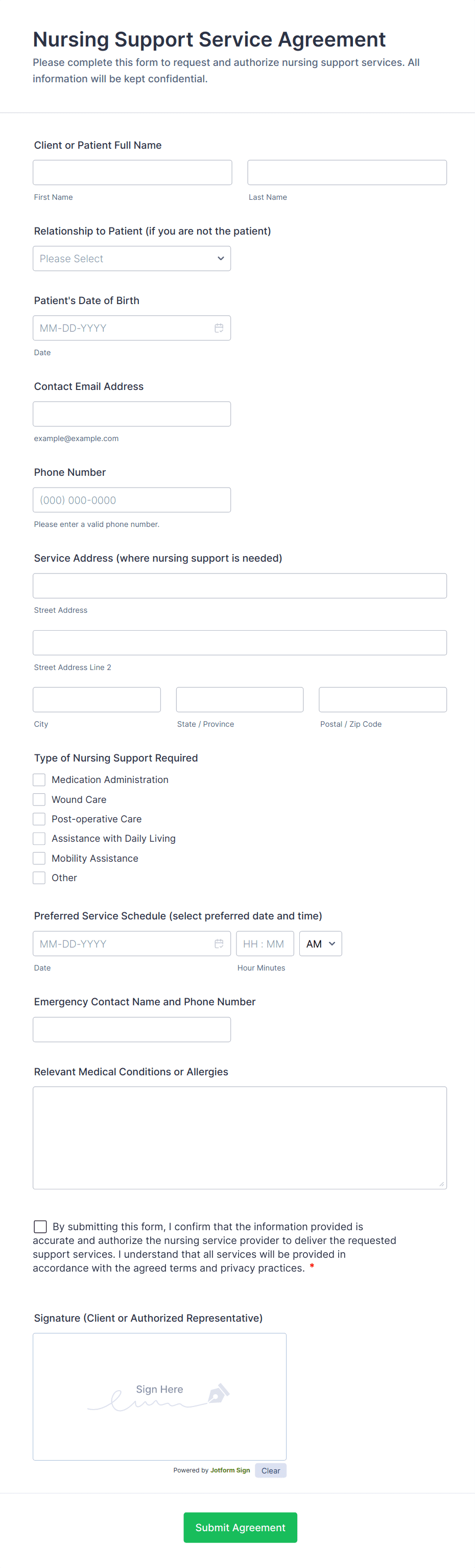 Need a quick but secure way to collect nursing information for your practice? Switch from paper forms to online forms and give your nurses a better way to gather health data from any device with our free Nurse Forms. Explore templates that make it easy to collect surveys, registrations, and evaluations, or to track medications, complete performance evaluations, and accomplish other internal tasks. All of our templates are fully customizable with our drag-and-drop builder, so you can get the look you want with no coding required! Jotform even offers an option to upgrade for HIPAA compliance features. Create a complete online database of all your nursing information with Jotform’s powerful Nurse Forms.