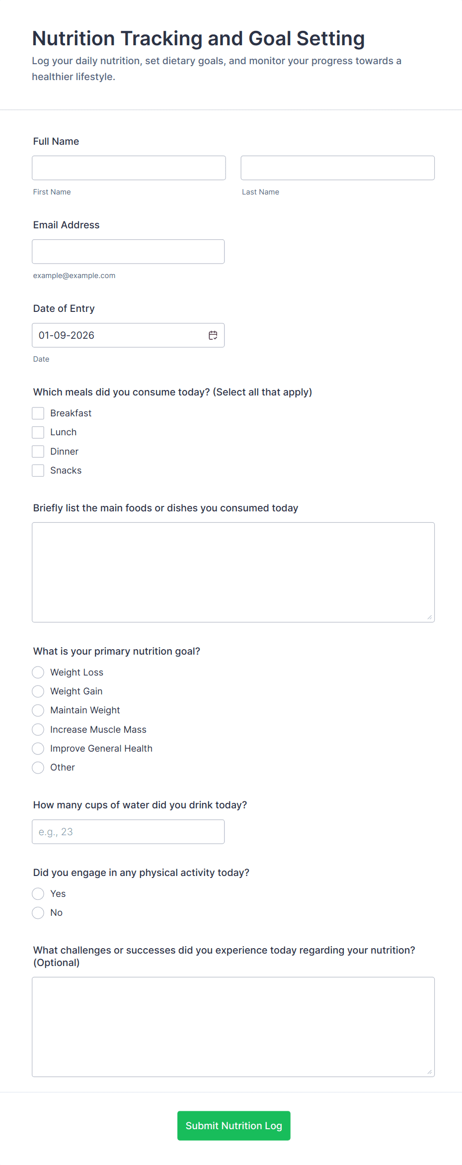 - Nutrition forms could include meal logs, calorie counts, and food groups