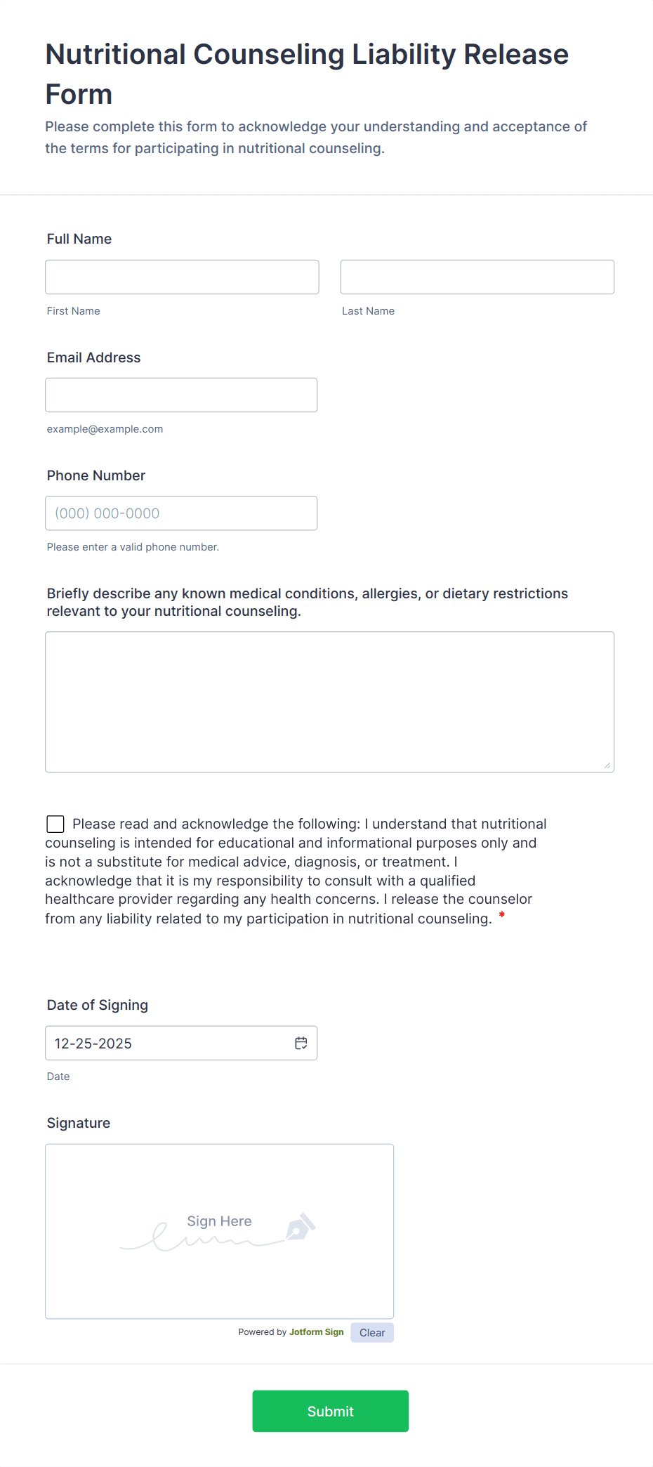 Collect and manage patient intake and dietary information with Jotform’s powerful Dietitian Forms. Choose one of our readymade form templates below based on your needs — whether it’s a BMI calculator, patient or eating habits questionnaire, nutrition diary, or calorie counter. Need to make some changes to your form? With our drag-and-drop form builder, you can easily add form elements, choose fonts and colors, upload images, edit text fields and checklist items, and much more. Patients can fill out your form from any device and submit their responses online, which are then stored in your secure Jotform account for ease of access. Help your patients achieve their dietary goals with these free Dietitian Forms.
