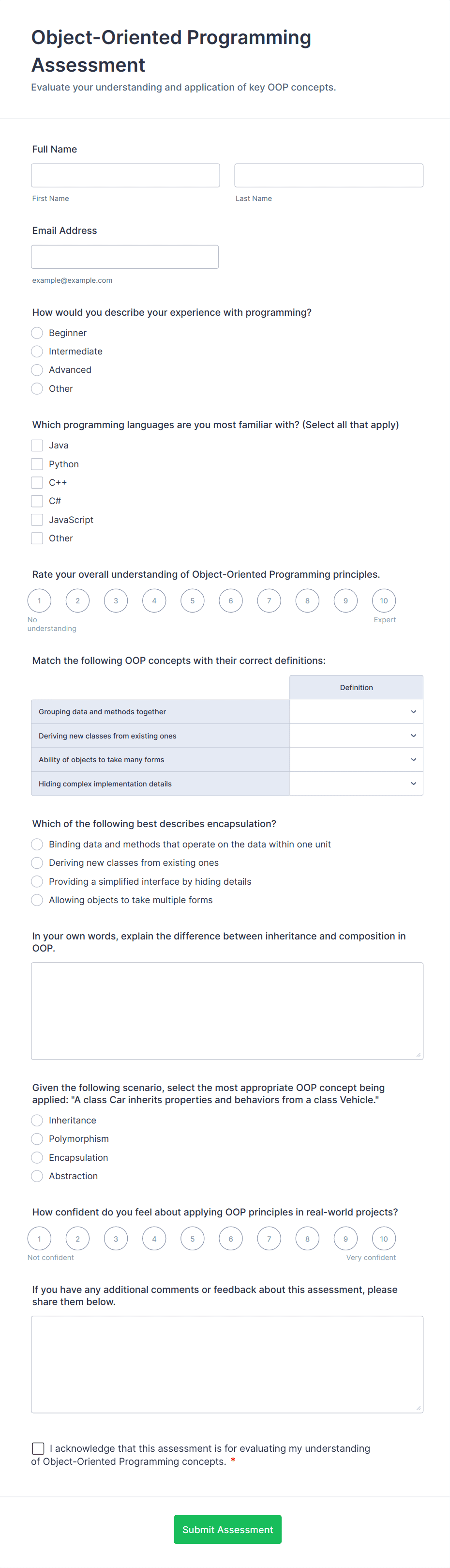 Assessment forms may include personal details, multiple-choice or open-ended questions, rating scales, comment sections, and sometimes automated scoring or feedback fields, depending on the purpose.