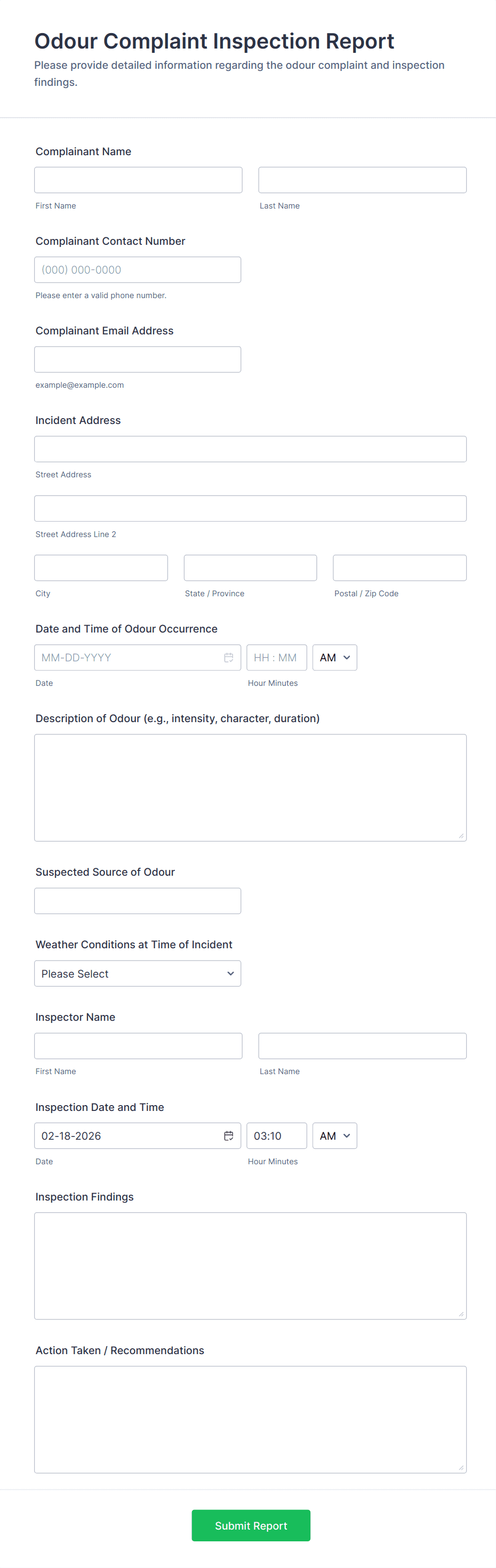 Typical fields include the complainant’s contact details, date and time of the incident, a detailed description of the issue, relevant documentation, and preferred resolution.
