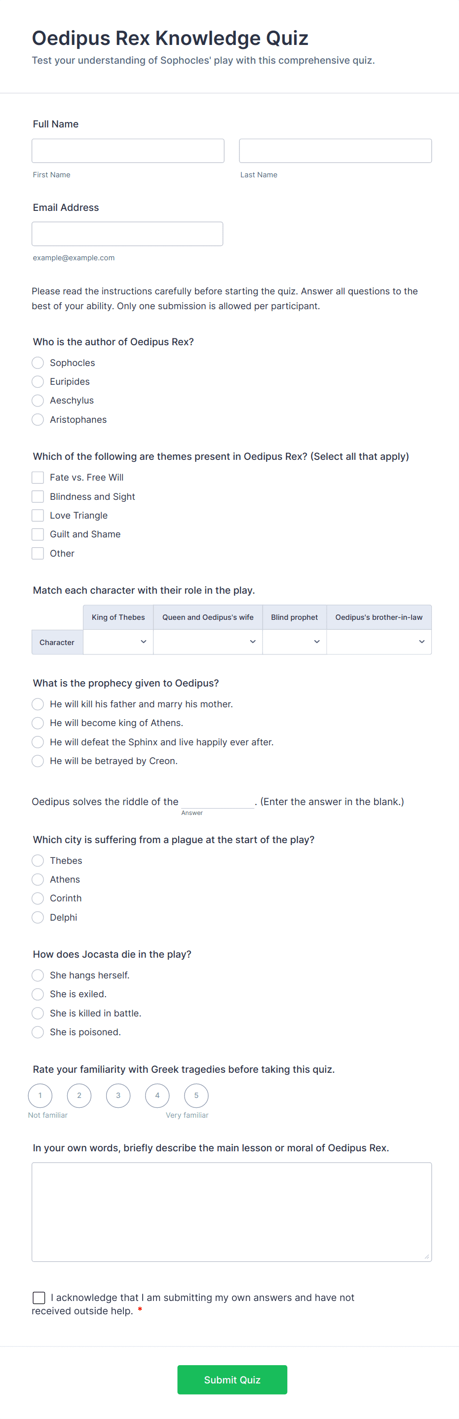 Test your students on what they know with our free online Multiple Choice Test Template! Just add your test’s questions and answers to this template, embed the test on your website or email a link to students, and start accepting submissions instantly.