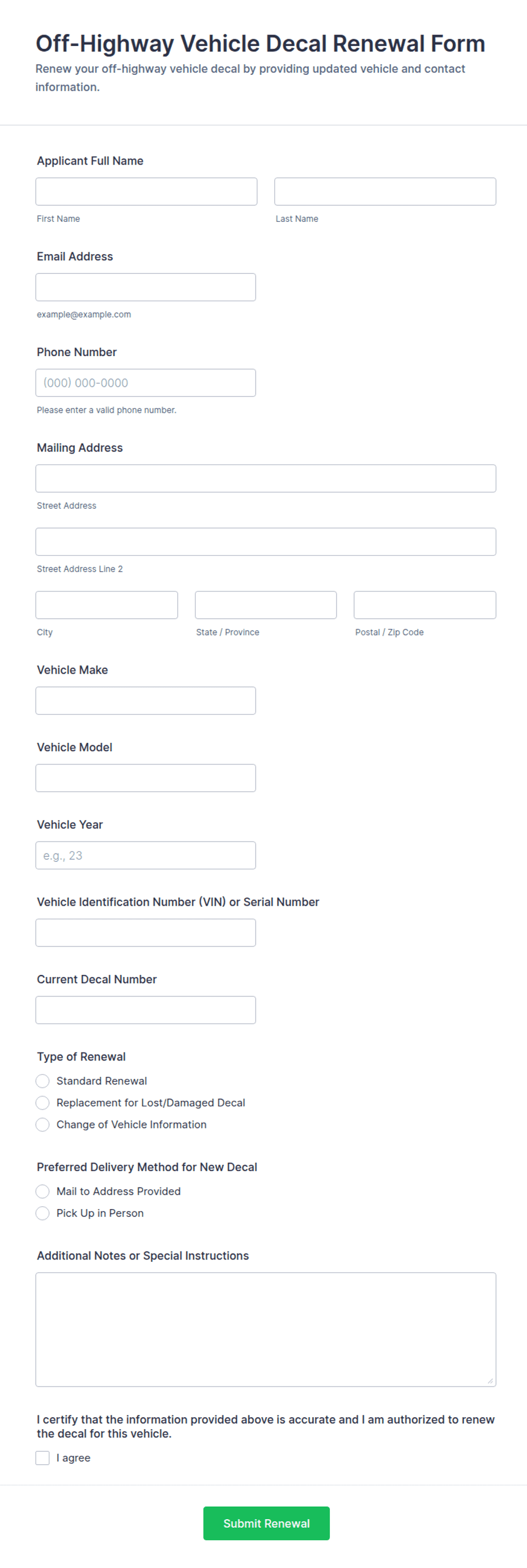 Off-Highway Vehicle Decal Renewal Form helps agencies and authorized vendors collect renewal requests online, confirm vehicle details, and manage decal renewals with consistent data collection through Jotform.