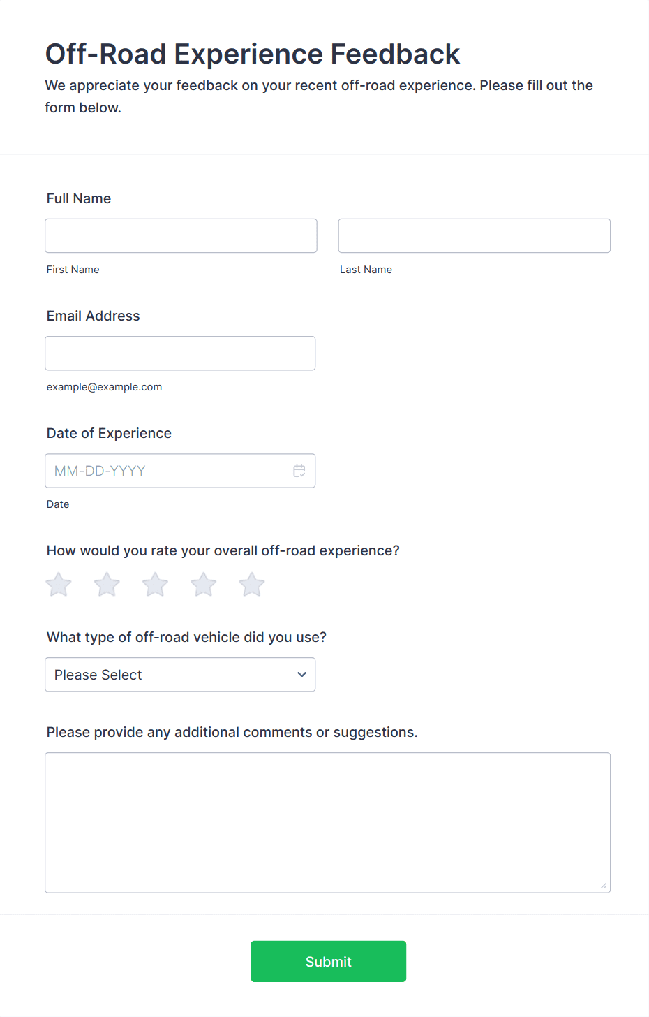 • Product feedback forms may include questions about usability, features, and likelihood to recommend.