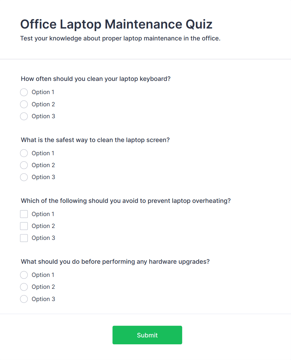 • For educational or compliance quizzes, include a mix of question types and set correct answers for automatic scoring.