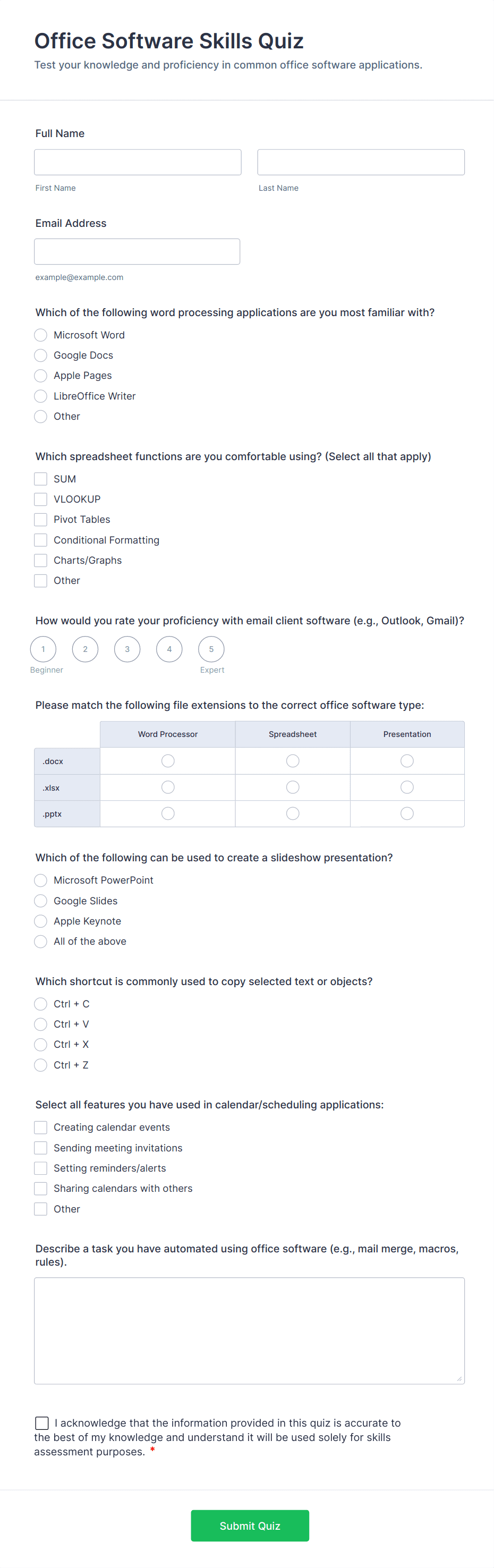• For educational or compliance quizzes, include a mix of question types and set correct answers for automatic scoring.