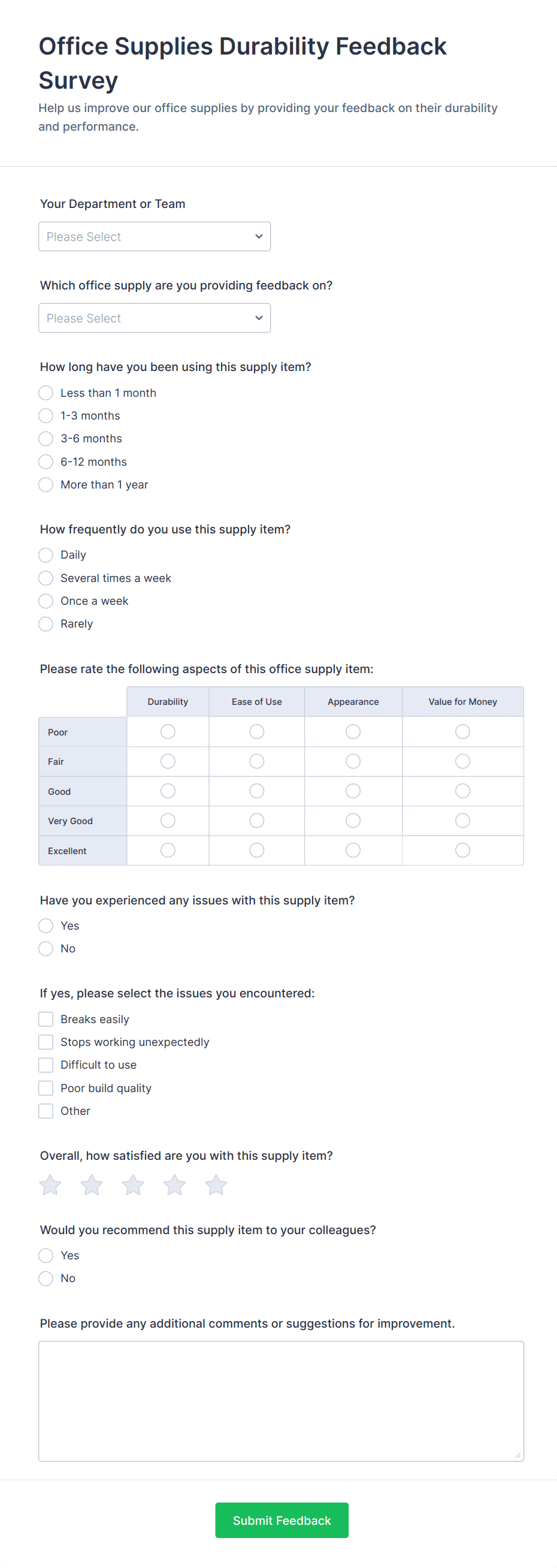 • For customer feedback, include questions about satisfaction, product quality, and likelihood to recommend.