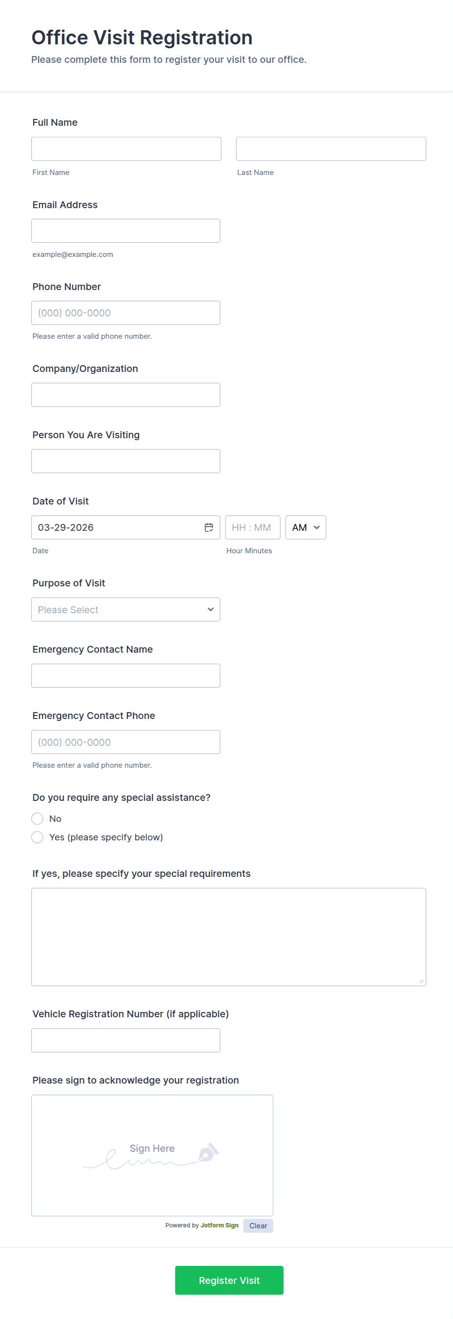 - Specialized Fields: Company/organization, reason for visit, or appointment details.