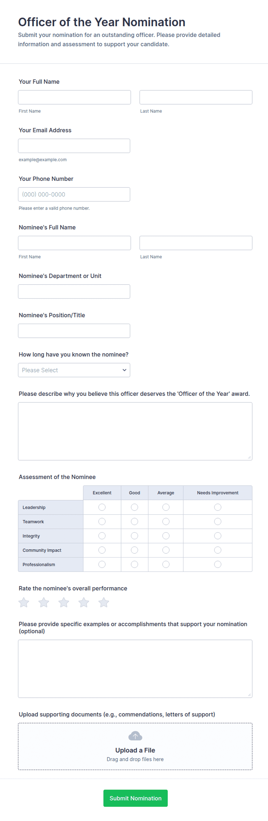 Common fields include nominee details, nomination category, justification aligned to criteria, supporting examples, and attachments or references.