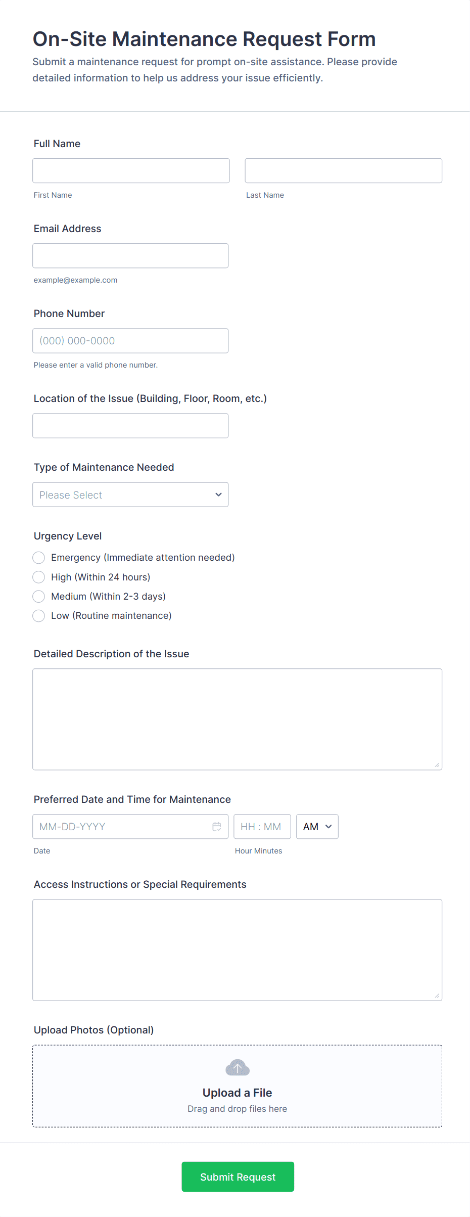 A maintenance request form is used by both property owners and building managers to identify maintenance issues and submit service requests. Easy to use. No coding.