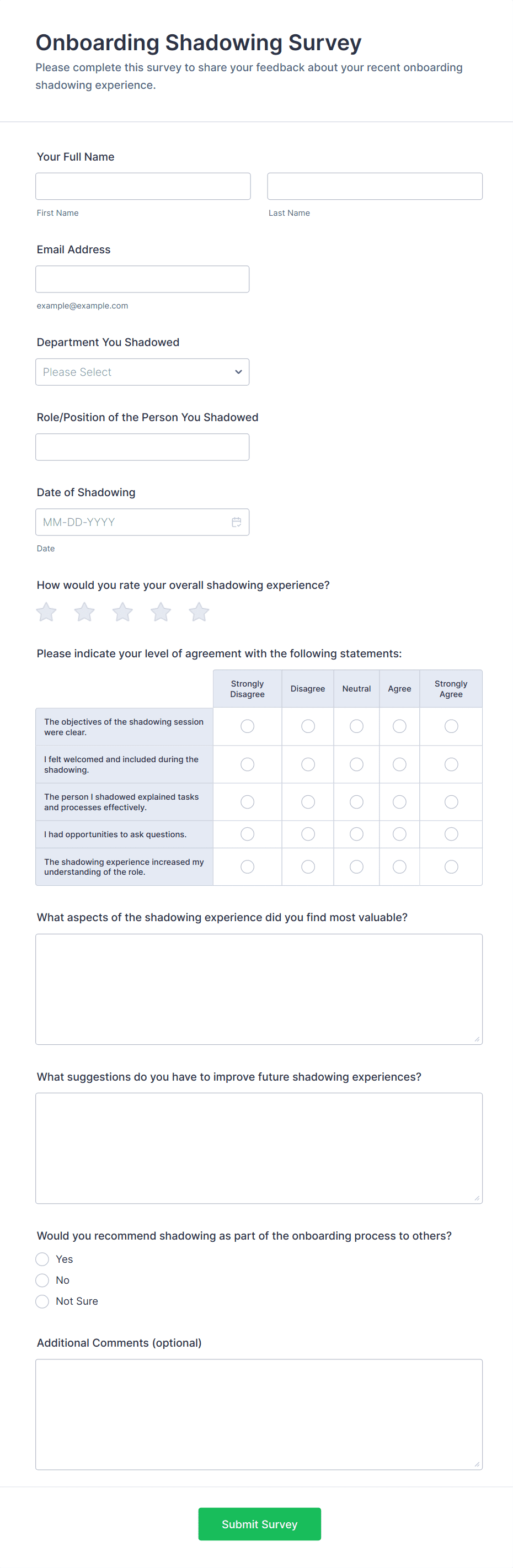An Onboarding Feedback Questionnaire is a form template designed to gather actionable insights that enable organizations to continuously improve their onboarding processes, enhance employee engagement and retention, and ensure alignment with company culture and values.