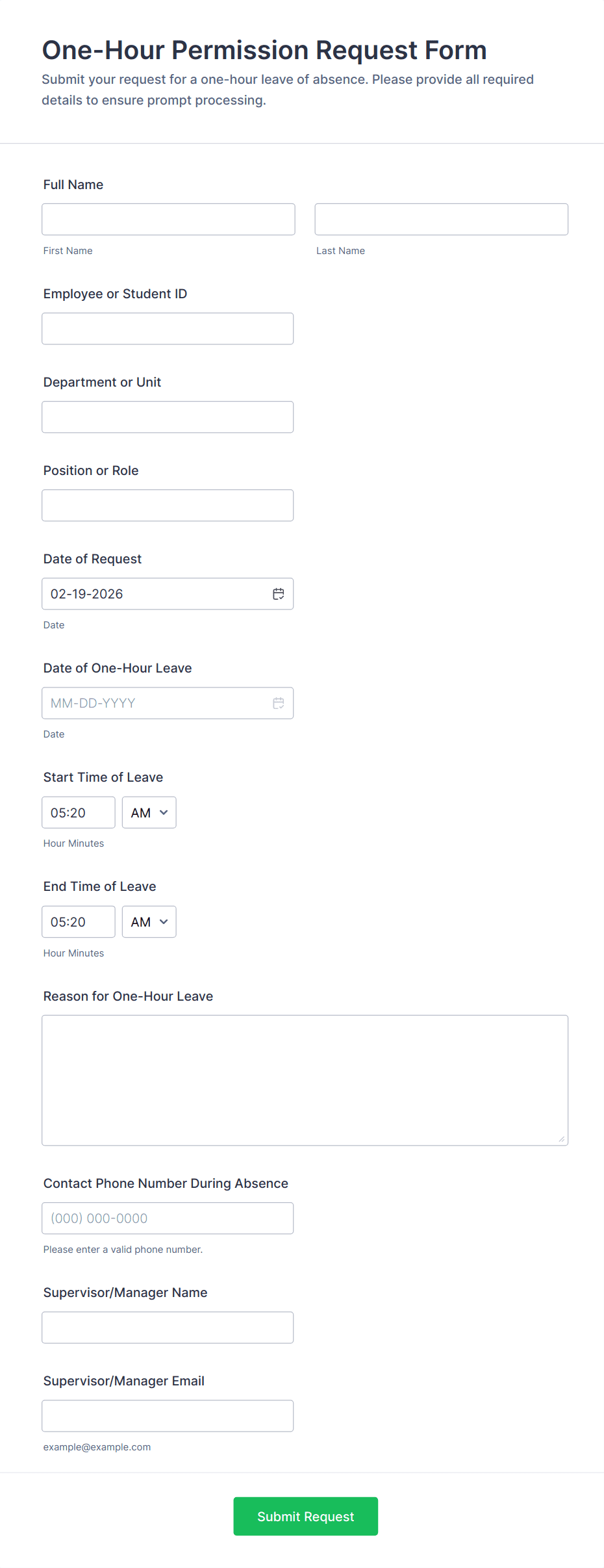 3. Parental or Family Leave: Collects detailed information for extended absences, such as maternity, paternity, or family care.