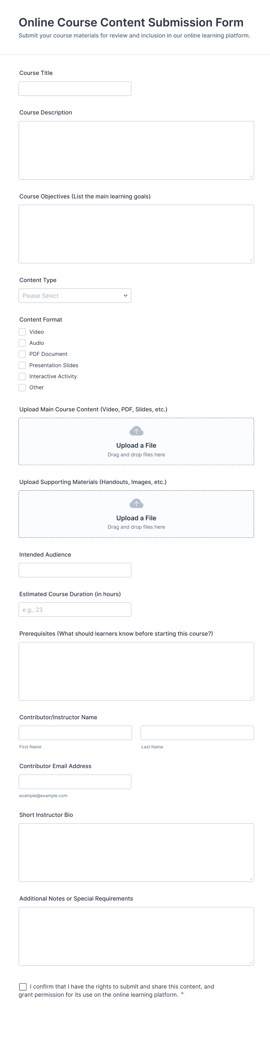 Content Forms are specialized online forms designed to facilitate the collection, submission, and management of various types of content. These forms are commonly used for gathering articles, blog posts, creative writing, multimedia files, user-generated content, feedback, and editorial submissions. Organizations, publishers, marketing teams, and educators often rely on Content Forms to streamline the process of receiving and organizing content from contributors, freelancers, or the public. Whether you’re running a magazine, managing a content marketing campaign, or collecting student assignments, Content Forms help ensure that submissions are structured, complete, and easy to review.