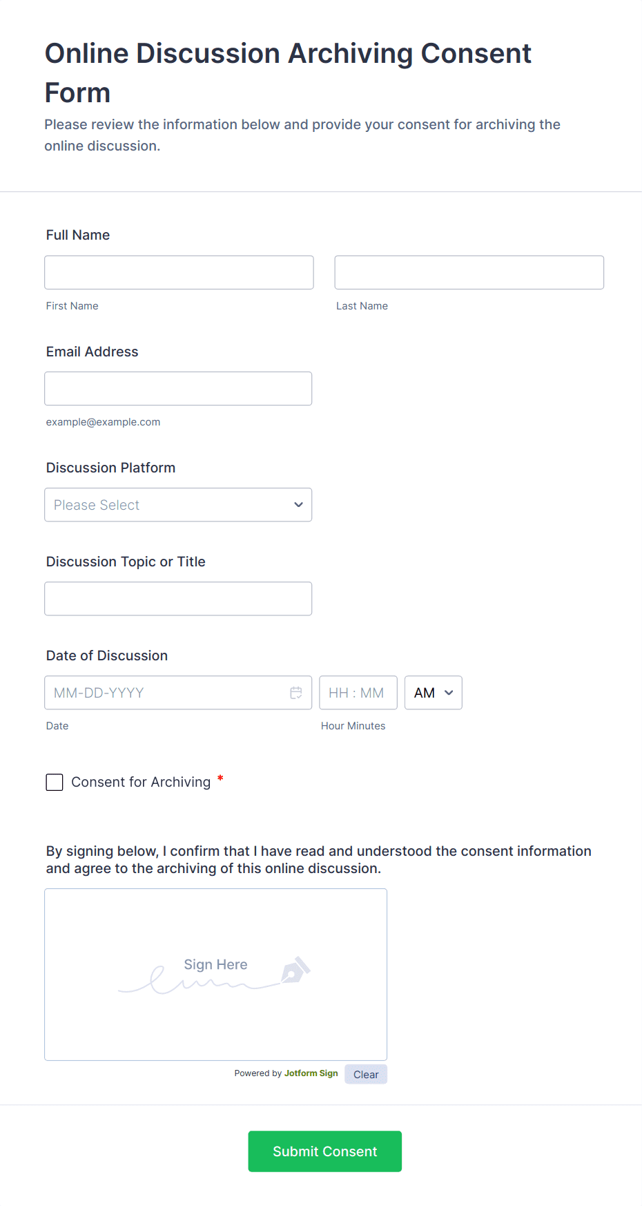 Creating a recording consent form with Jotform is a straightforward process that can be tailored to fit a variety of use cases, from academic research to media production. Here’s a step-by-step guide to help you design an effective consent form: