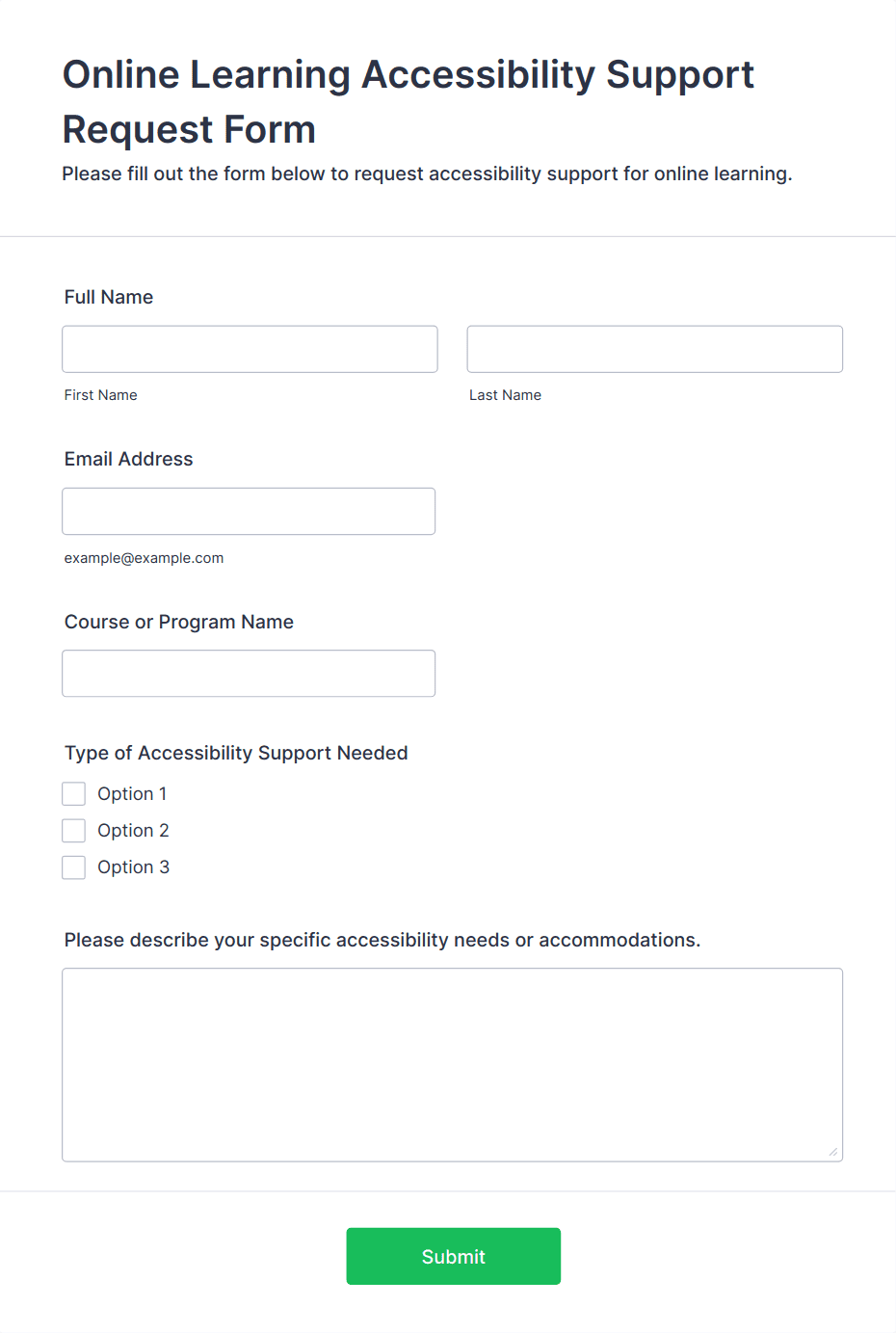 An education form template is a pre-designed online form tailored for academic purposes, such as student registration, feedback collection, event sign-ups, and more. These templates help schools and educators collect and manage information efficiently.