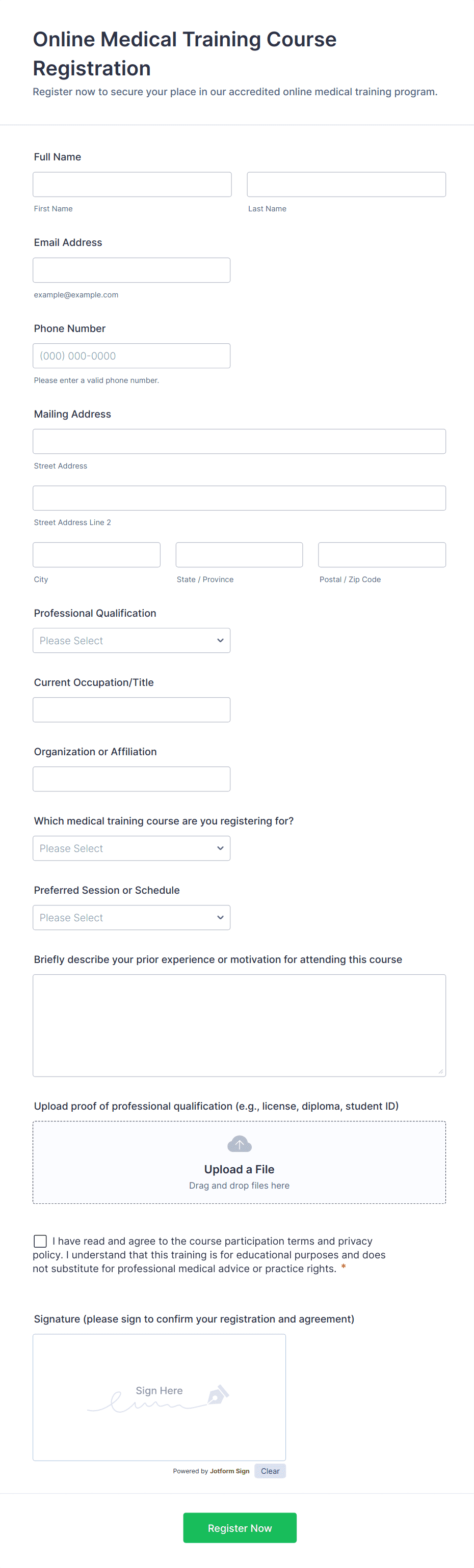 Creating a course enrollment form with Jotform is a straightforward process that can be customized to fit any educational or training scenario. Whether you’re managing university course registrations, online class sign-ups, or corporate training enrollments, Jotform’s flexible platform allows you to design forms that capture all the necessary information and streamline the enrollment process.