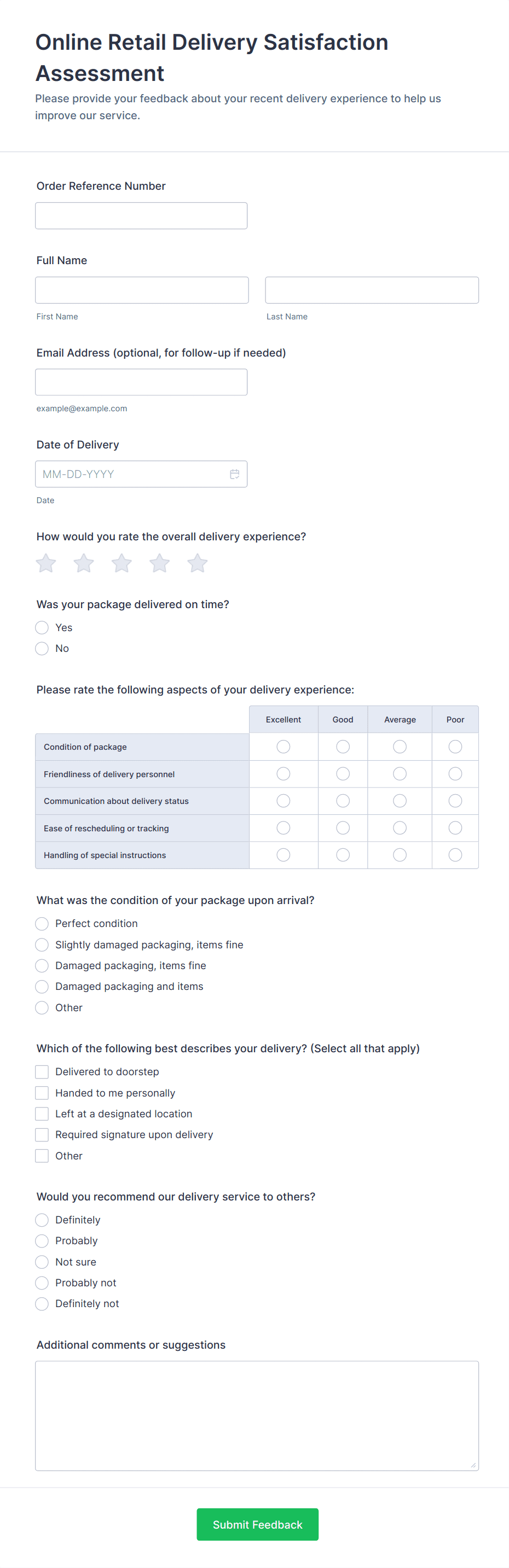 • Retail feedback forms may include order details, product ratings, and delivery experience questions.