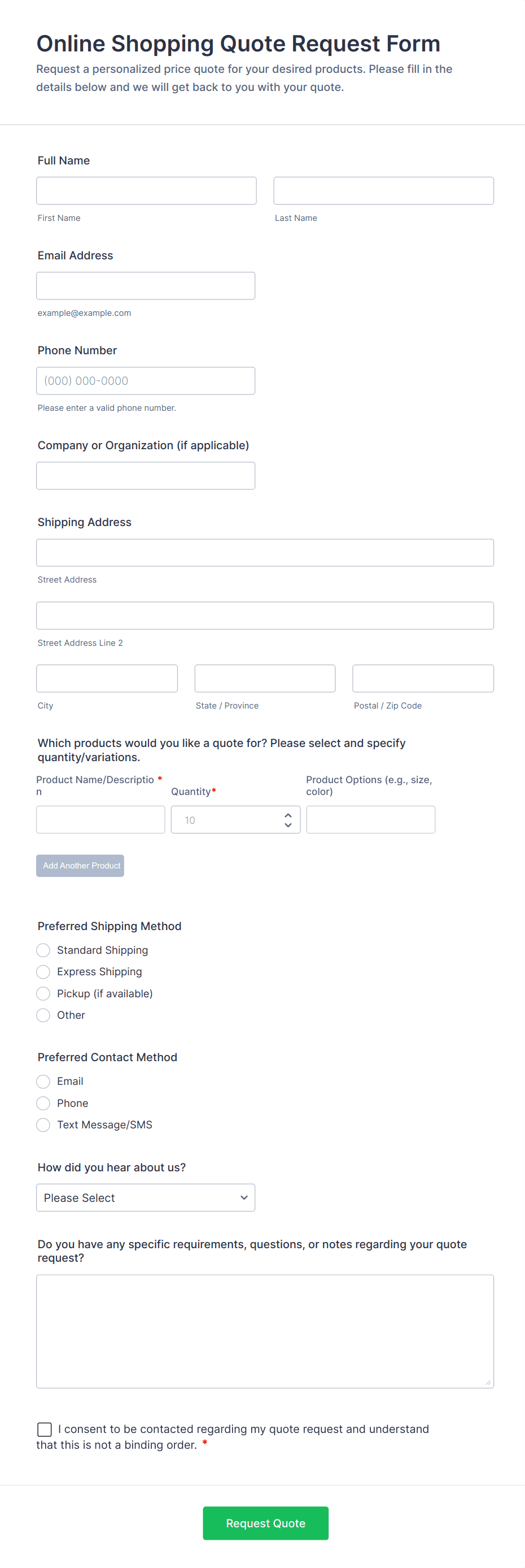 Quote forms are specialized online forms designed to collect information from customers or clients seeking a price estimate for products or services. These forms are commonly used by businesses in industries such as insurance, construction, event planning, logistics, and professional services, where pricing can vary based on specific requirements. By gathering essential details—such as project scope, service preferences, quantities, and contact information—quote forms enable businesses to provide accurate, tailored quotes efficiently. They streamline the initial inquiry process, reduce back-and-forth communication, and help both parties set clear expectations from the outset.