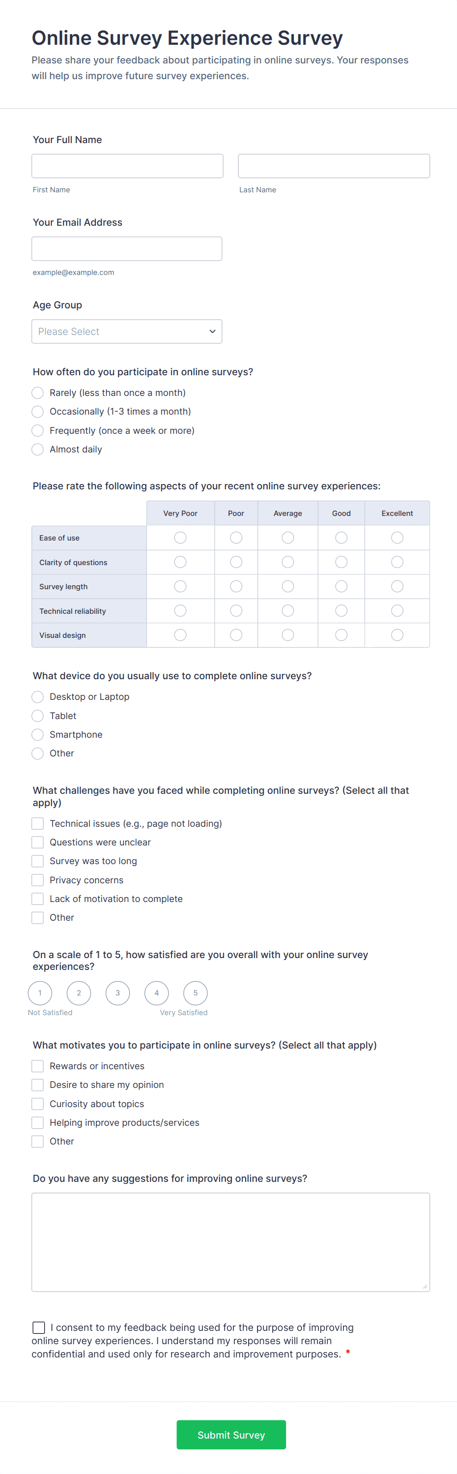 Survey templates are pre-designed forms that help individuals and organizations collect feedback, opinions, or data from a target audience. These templates are widely used for a variety of purposes, such as customer satisfaction surveys, employee engagement assessments, market research, event feedback, and academic studies. By providing a structured set of questions, survey templates streamline the process of gathering valuable insights, making it easier to analyze trends, measure satisfaction, and make informed decisions. Whether you’re a business owner, HR professional, educator, or researcher, survey templates offer a quick and effective way to reach your audience and collect actionable information.