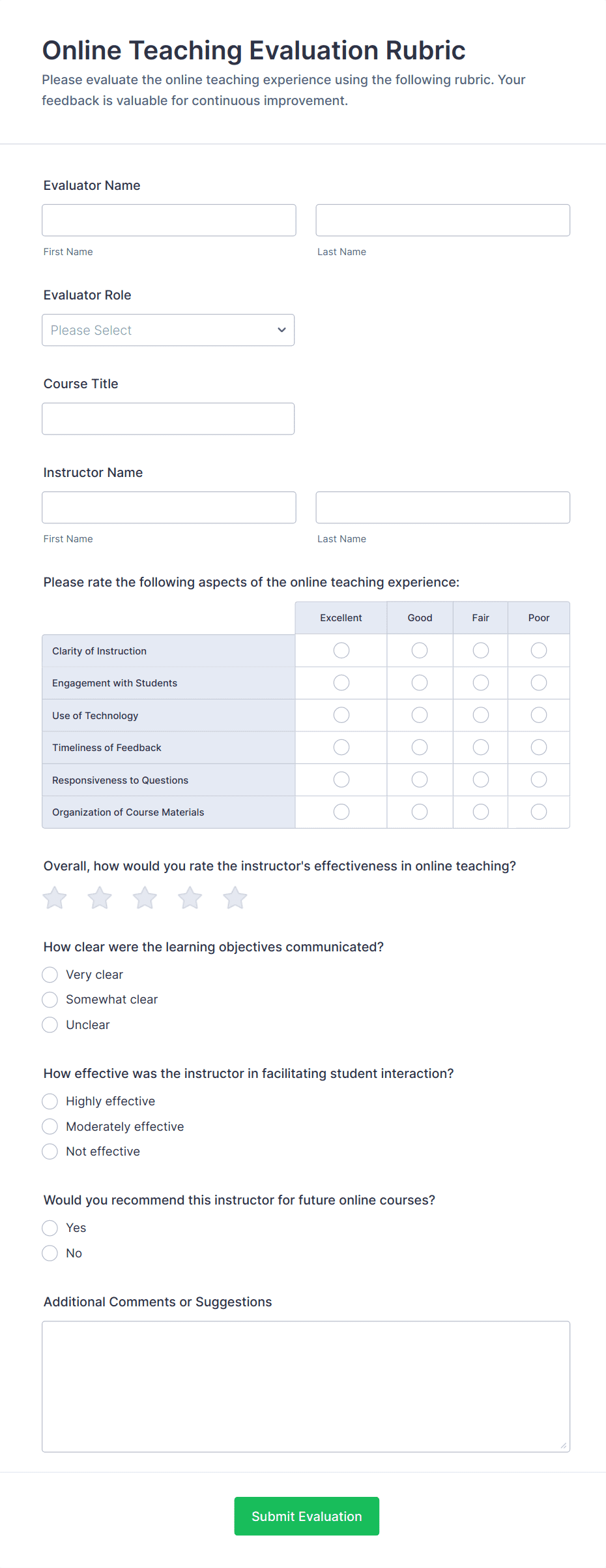 - Rating Scales: Likert scales or star ratings for aspects like subject knowledge, communication, classroom management, and engagement.