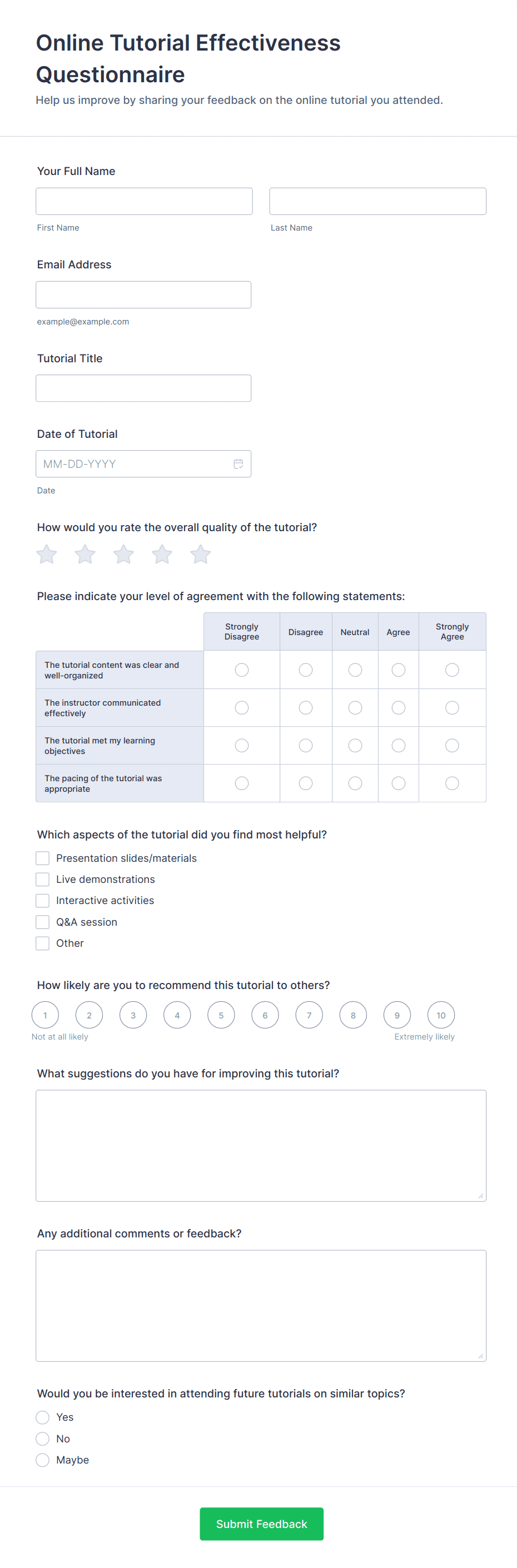 Use rating scales for clarity, usefulness, pacing, and satisfaction. Add short text fields for what worked well and what should improve.