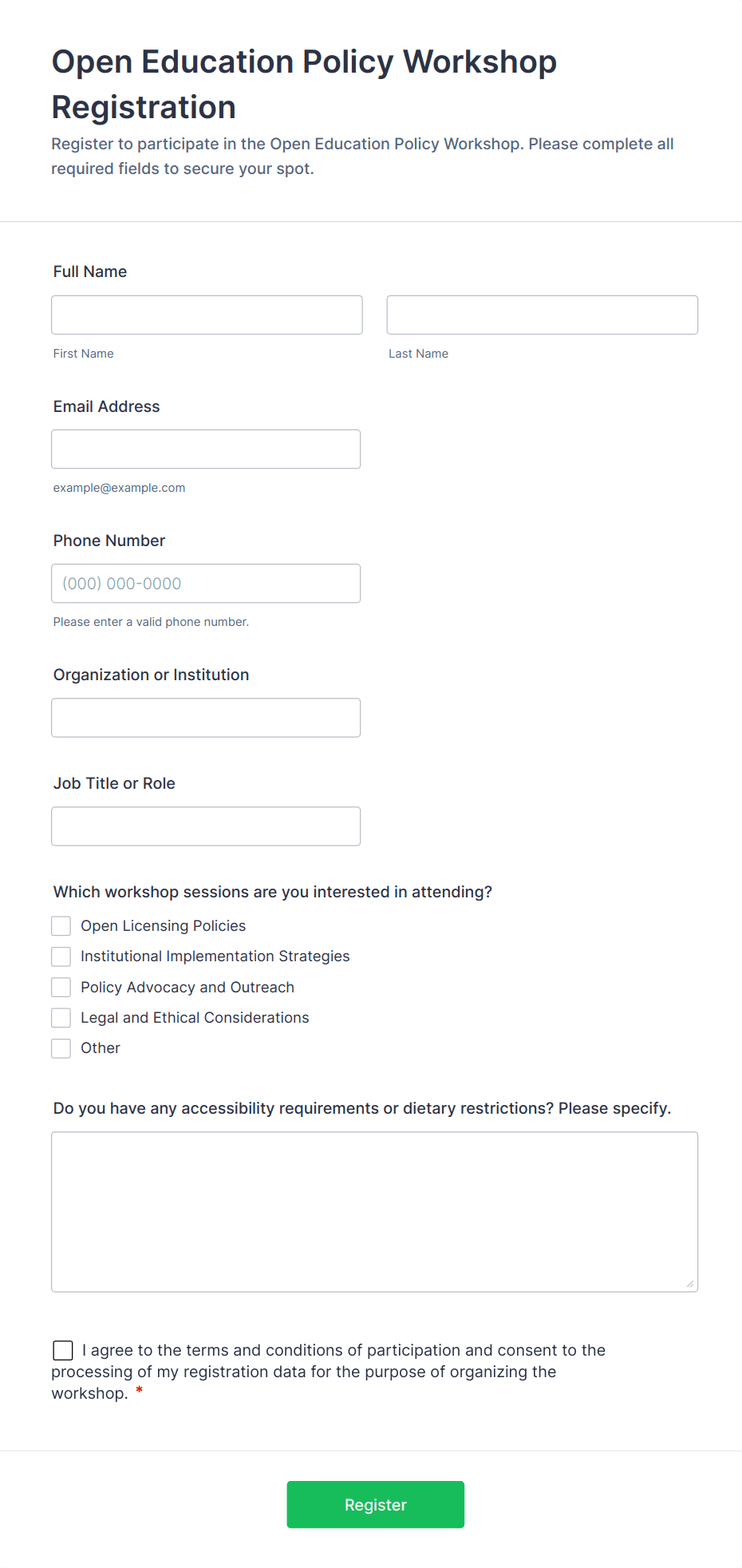 3. What information should be included in a workshop registration form?
