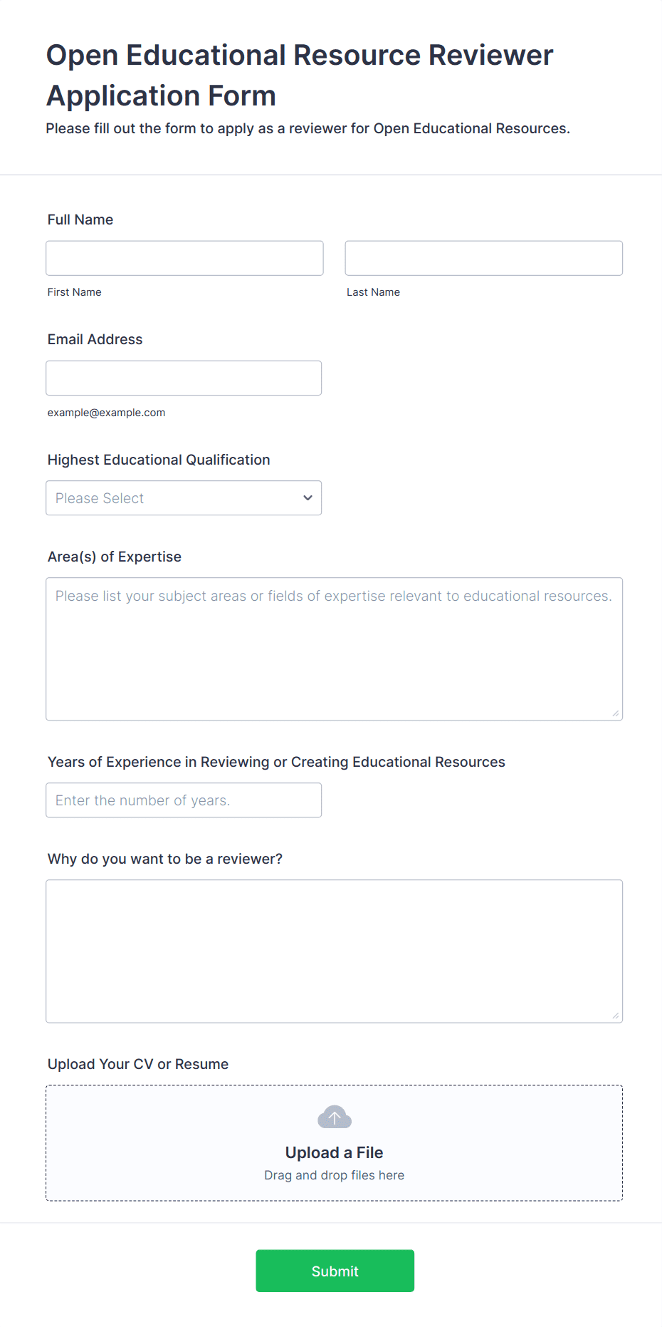 • For job applications, include fields for personal information, education, work experience, references, and file uploads for resumes or cover letters.