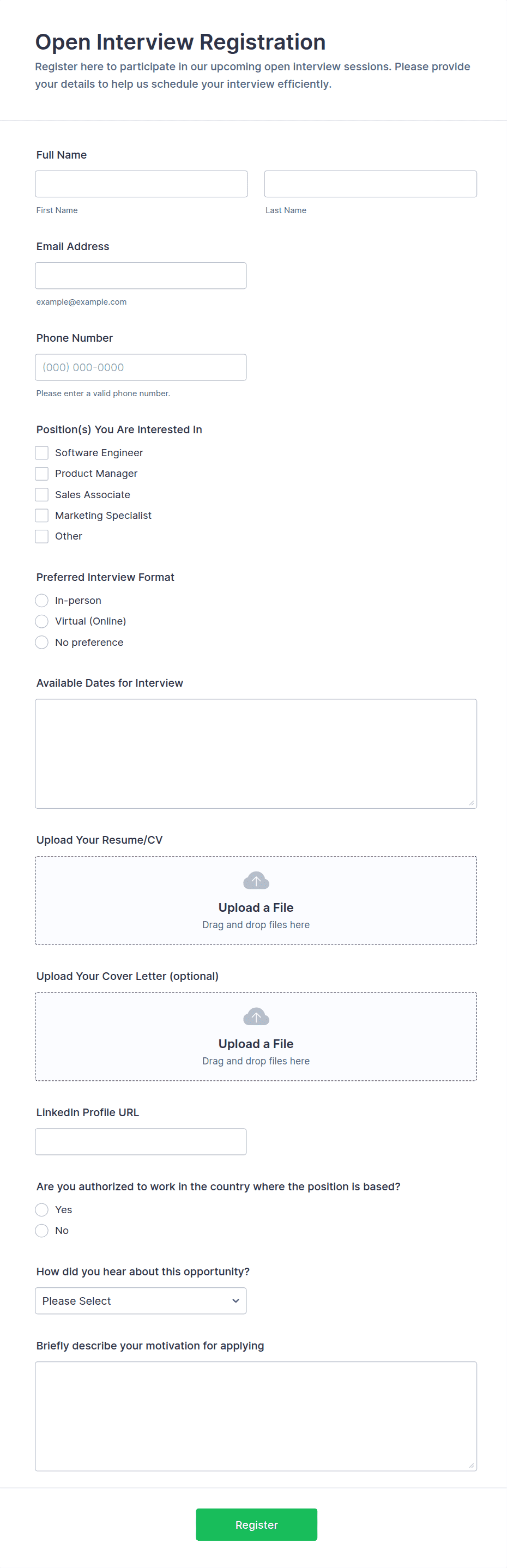 • File upload fields for resumes, portfolios, or supporting documents