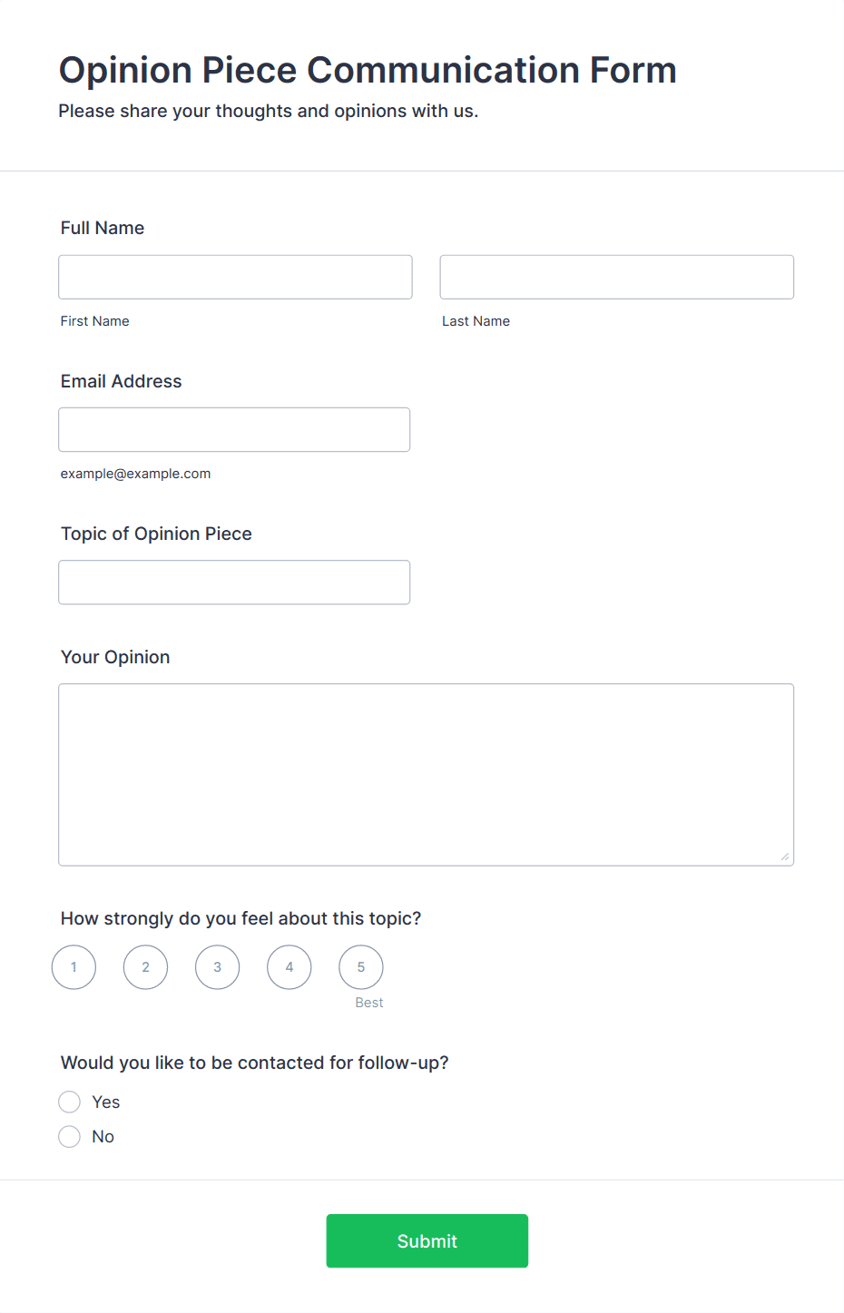 • Product feedback forms may include questions about usability, features, and likelihood to recommend.