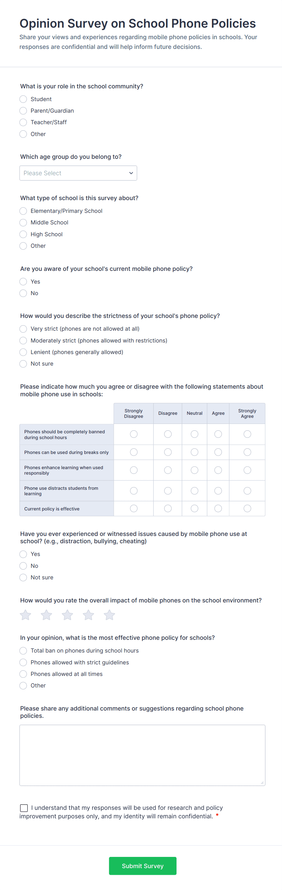 - For student or parent surveys, add questions about satisfaction, communication, and support services.