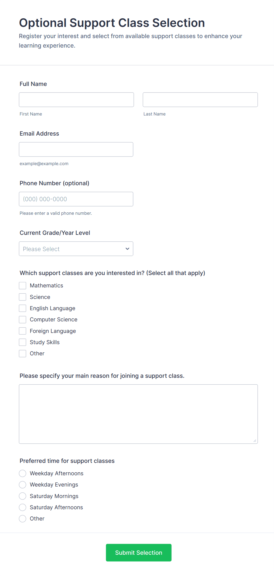 • Online Courses: Include fields for preferred learning times, technical requirements, and payment options.