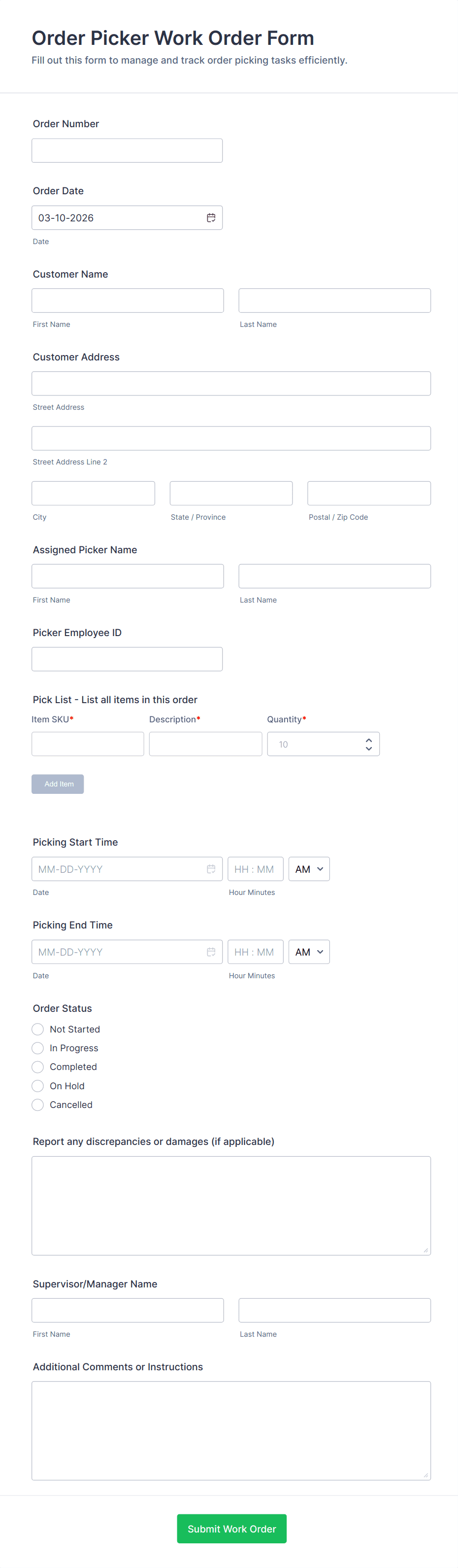 Work request forms are essential tools used by organizations to streamline the process of requesting, tracking, and managing work-related tasks or services. These forms serve as a standardized method for employees, clients, or stakeholders to submit requests for maintenance, IT support, facility repairs, project tasks, equipment needs, or any other service that requires attention from a specific department. By capturing all necessary details upfront, work request forms help ensure that requests are clear, actionable, and prioritized appropriately, reducing miscommunication and delays. Common use cases include internal maintenance requests, IT service tickets, project task assignments, and resource allocation requests.