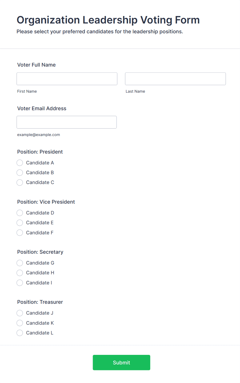 Voting forms are used by schools, businesses, clubs, nonprofits, event organizers, and any group needing to make collective decisions or gather opinions.